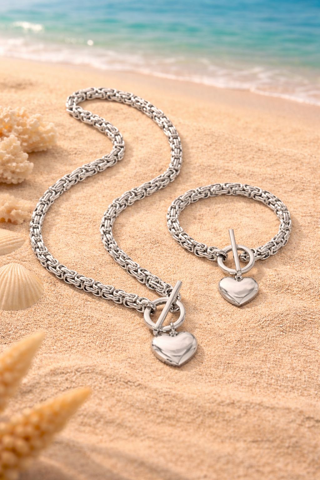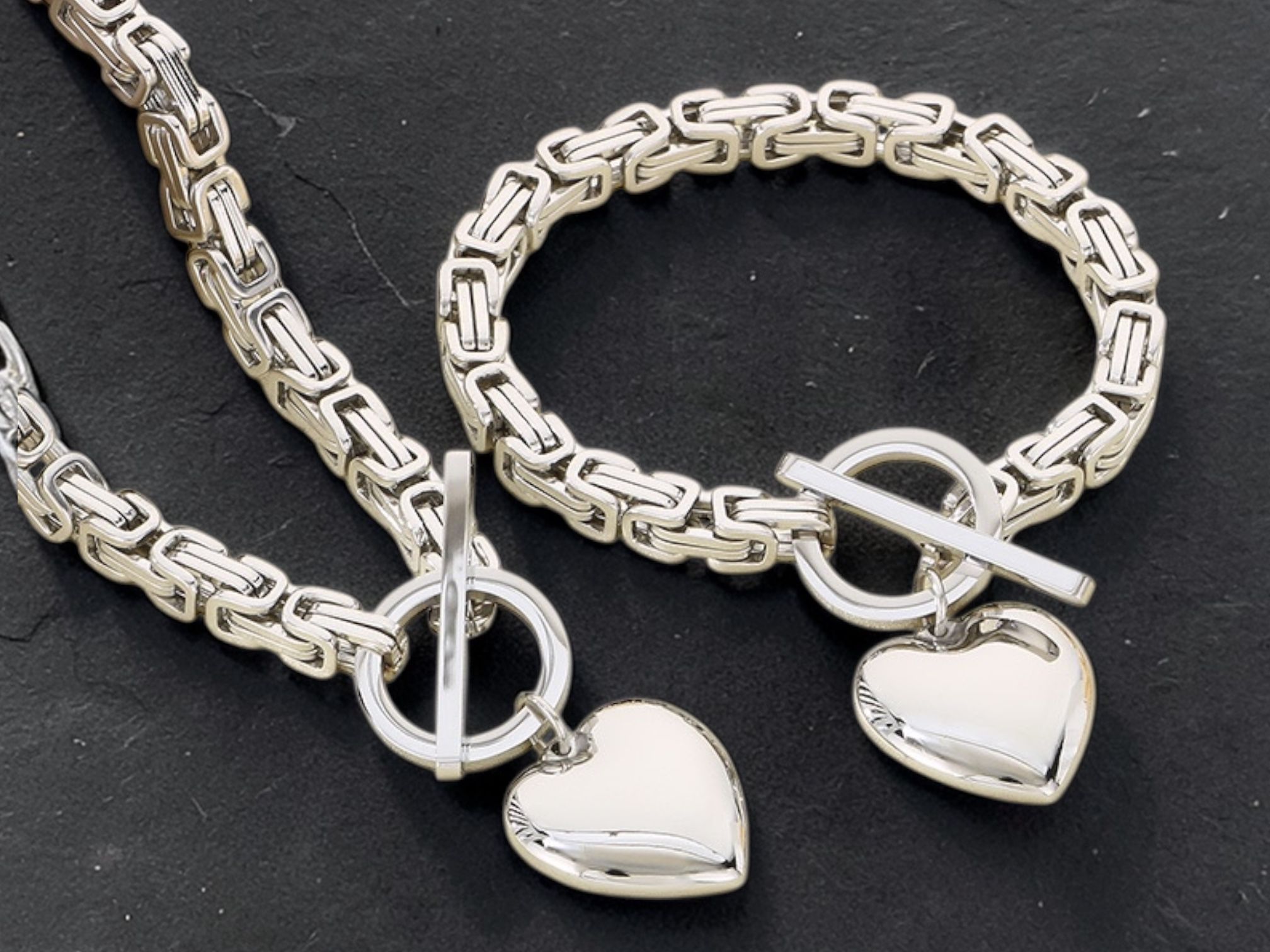 Bold chain links meet a polished heart charm in this statement bracelet and necklace. Featuring a luxe toggle clasp and high-shine finish, the Amara set is designed to turn heads — modern, powerful and unapologetically feminine.
