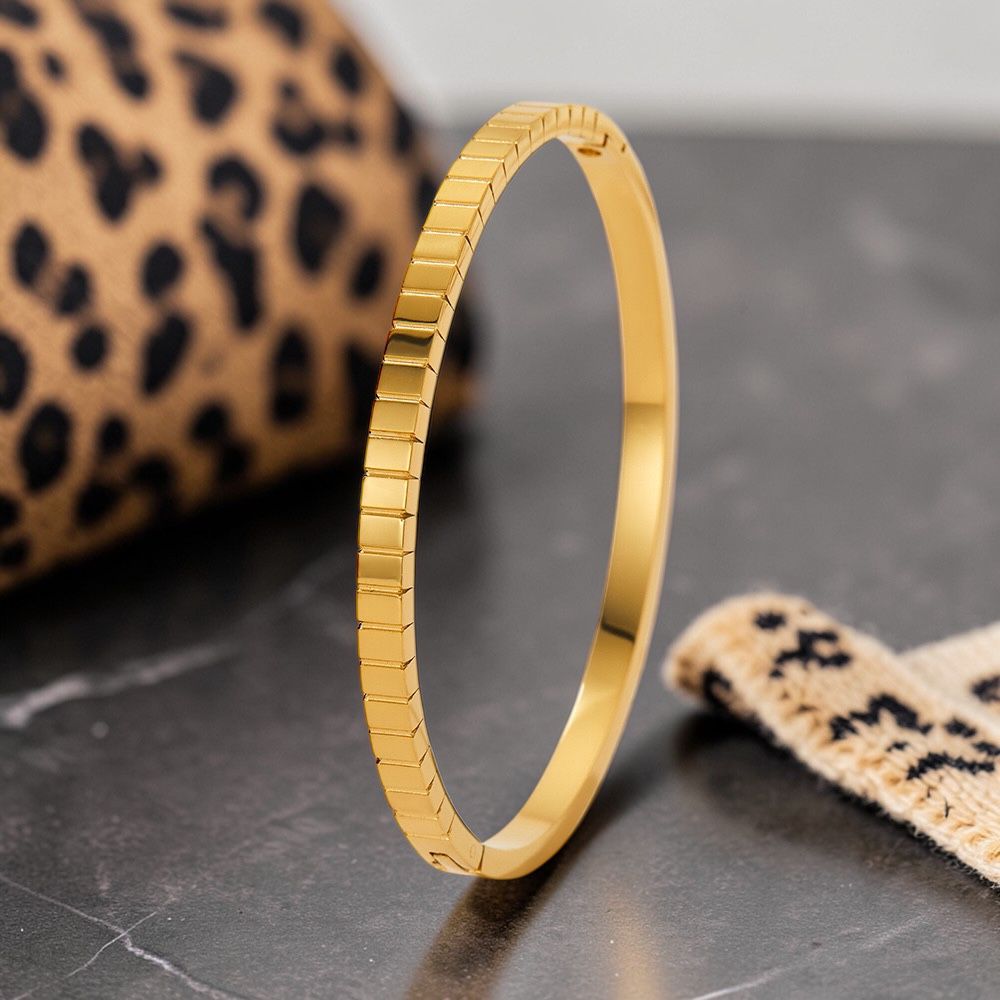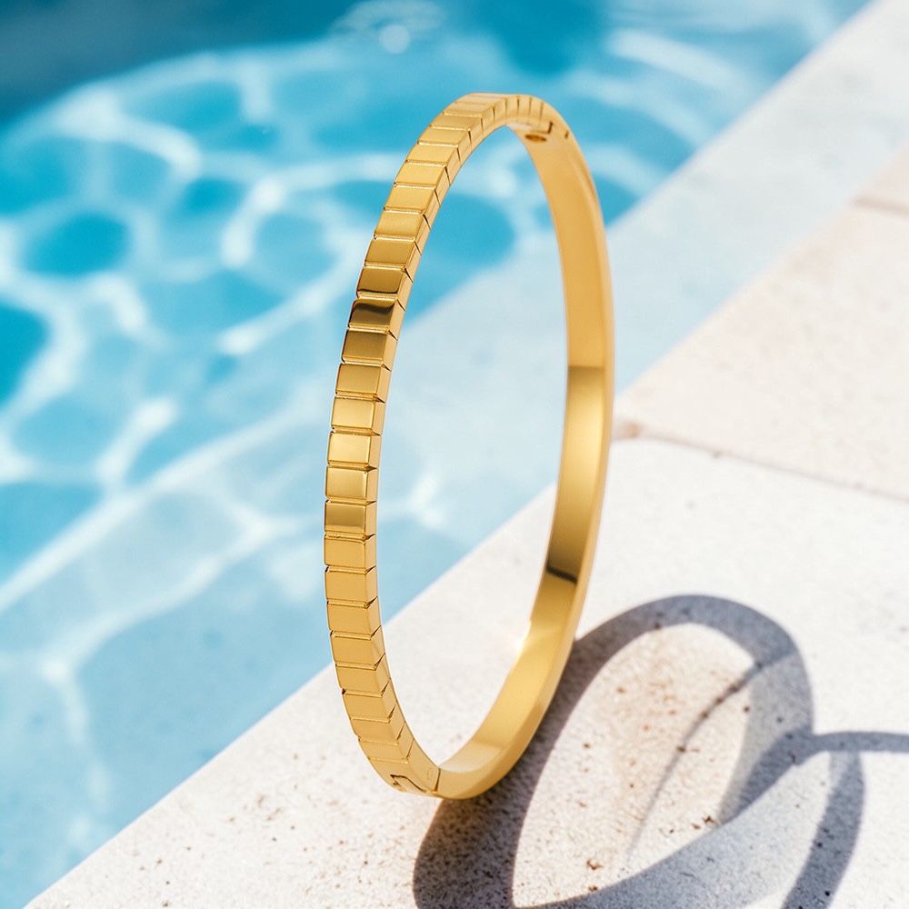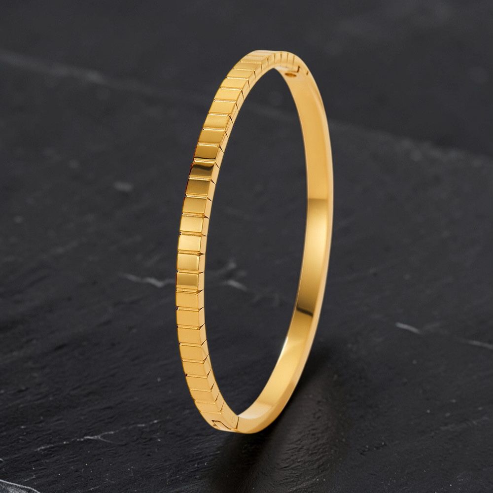 A bold twist on a classic silhouette, the Aurelia Edge Bangle features a sleek gold finish with a structured ridged detail that catches the light beautifully.