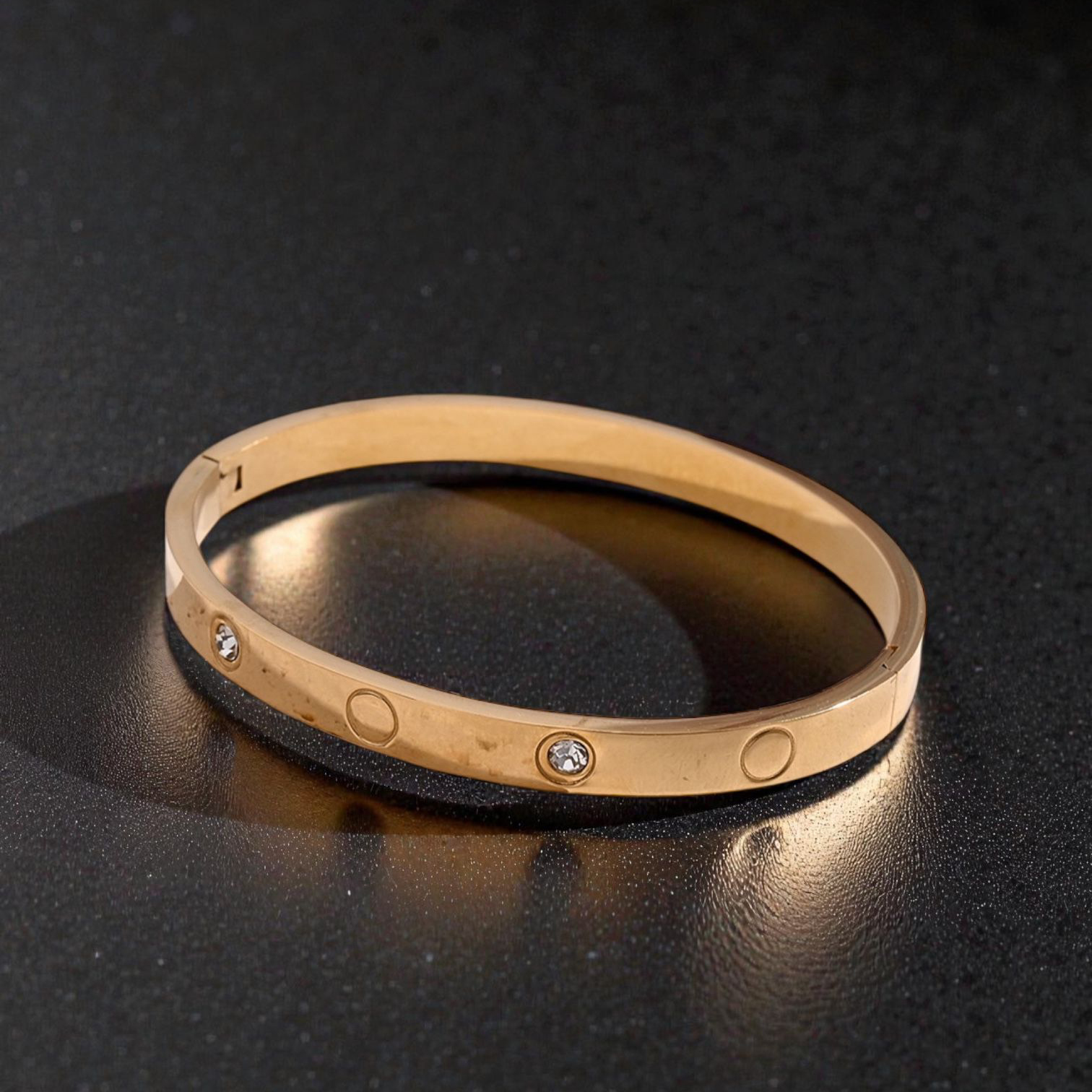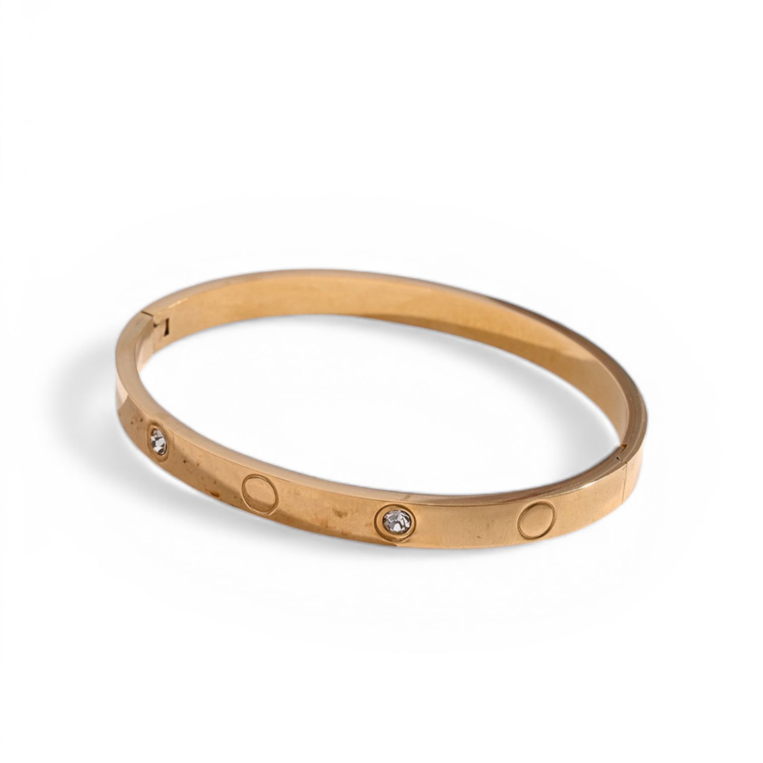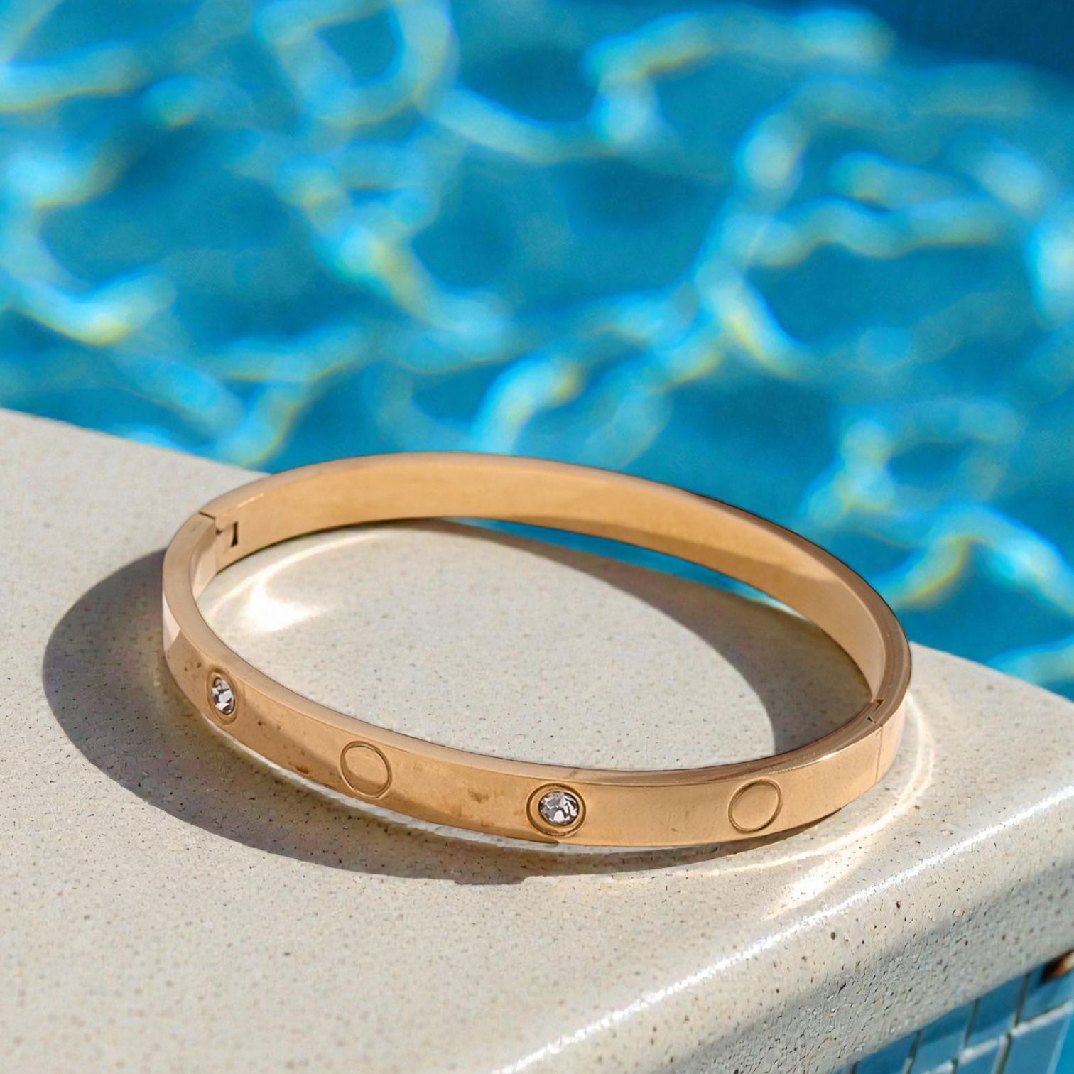 A sleek gold bangle accented with delicate crystal and signature circular detailing.