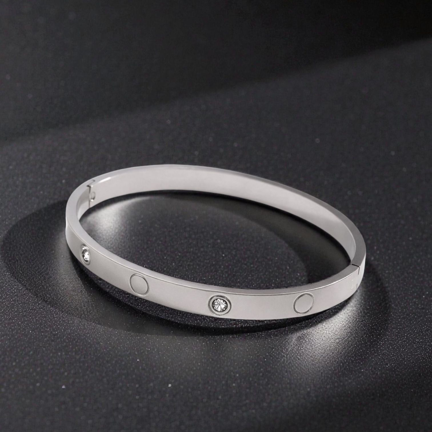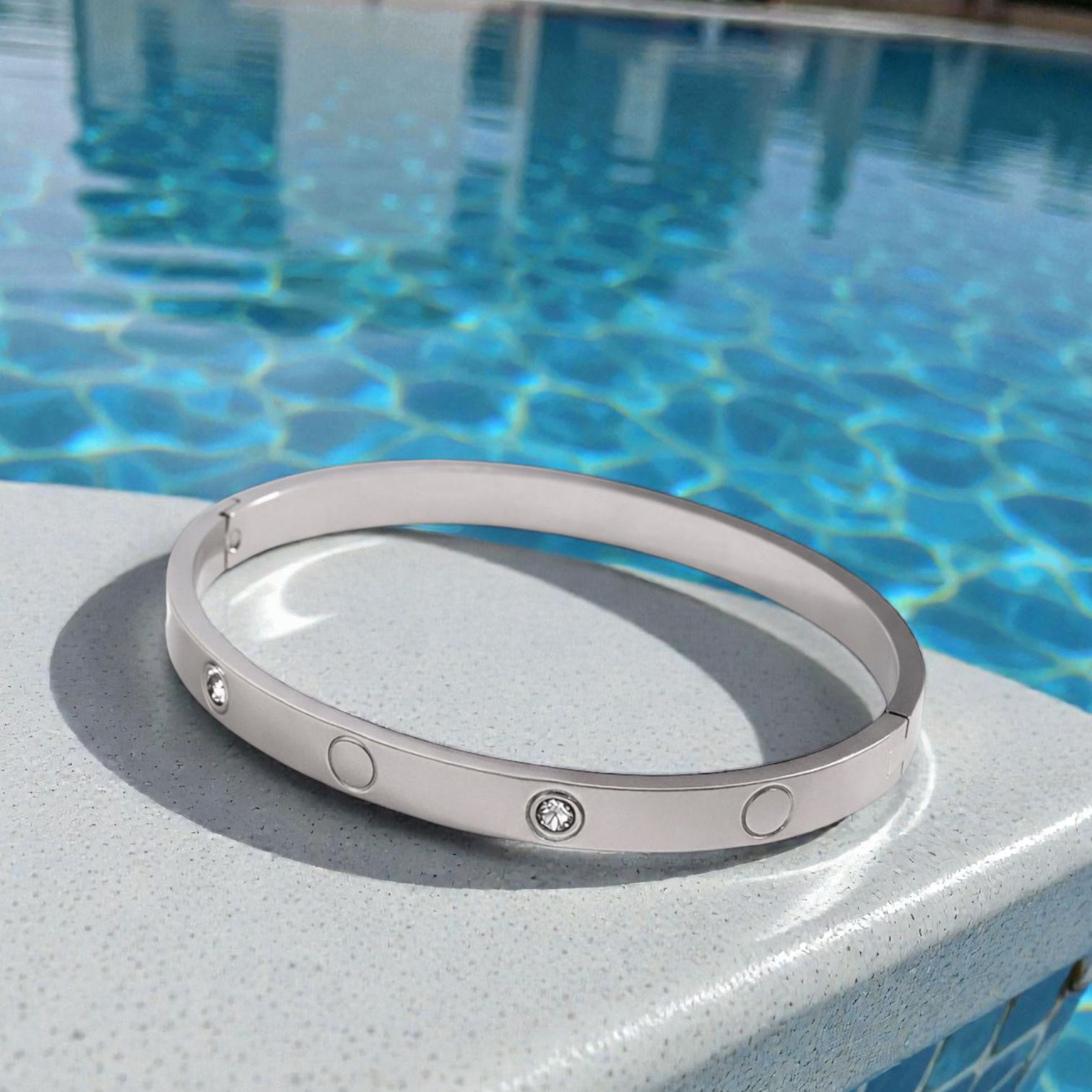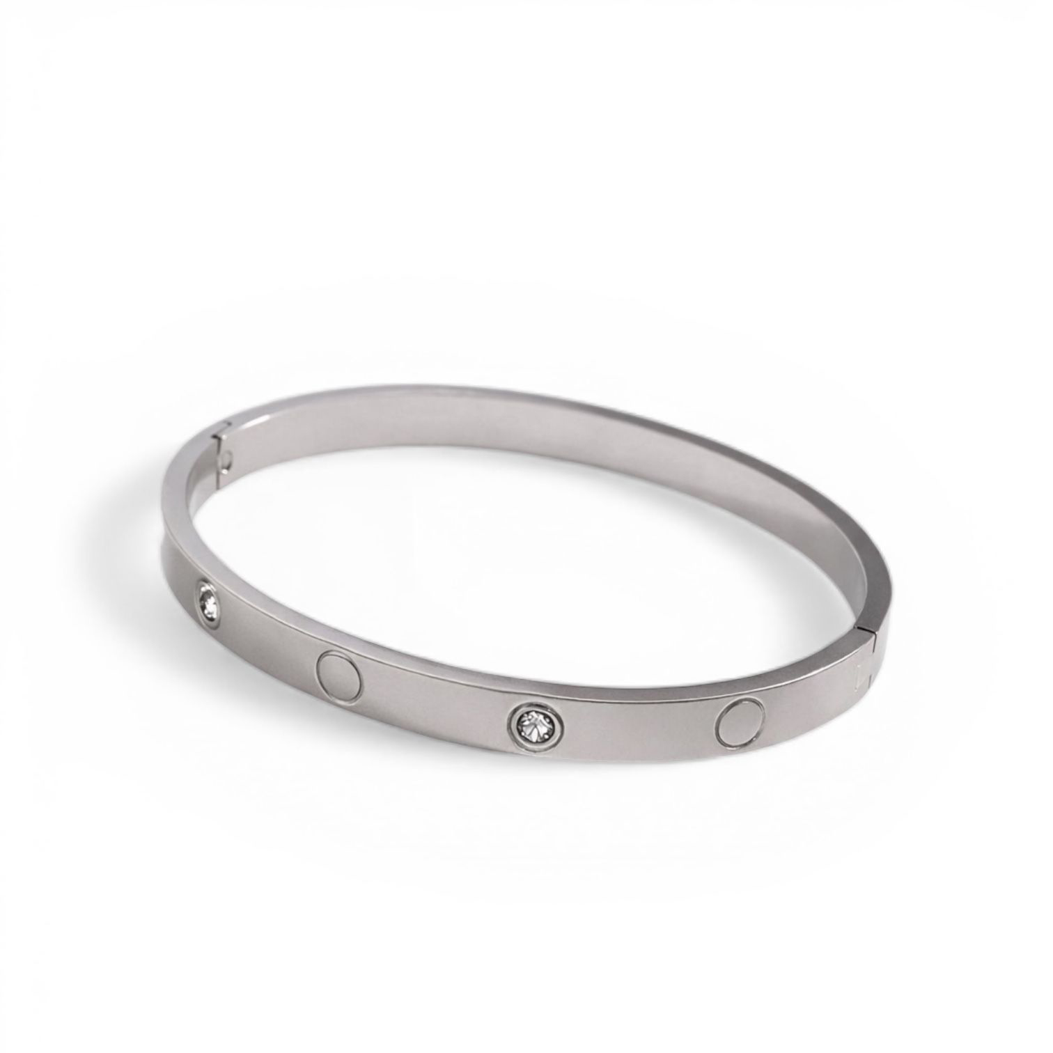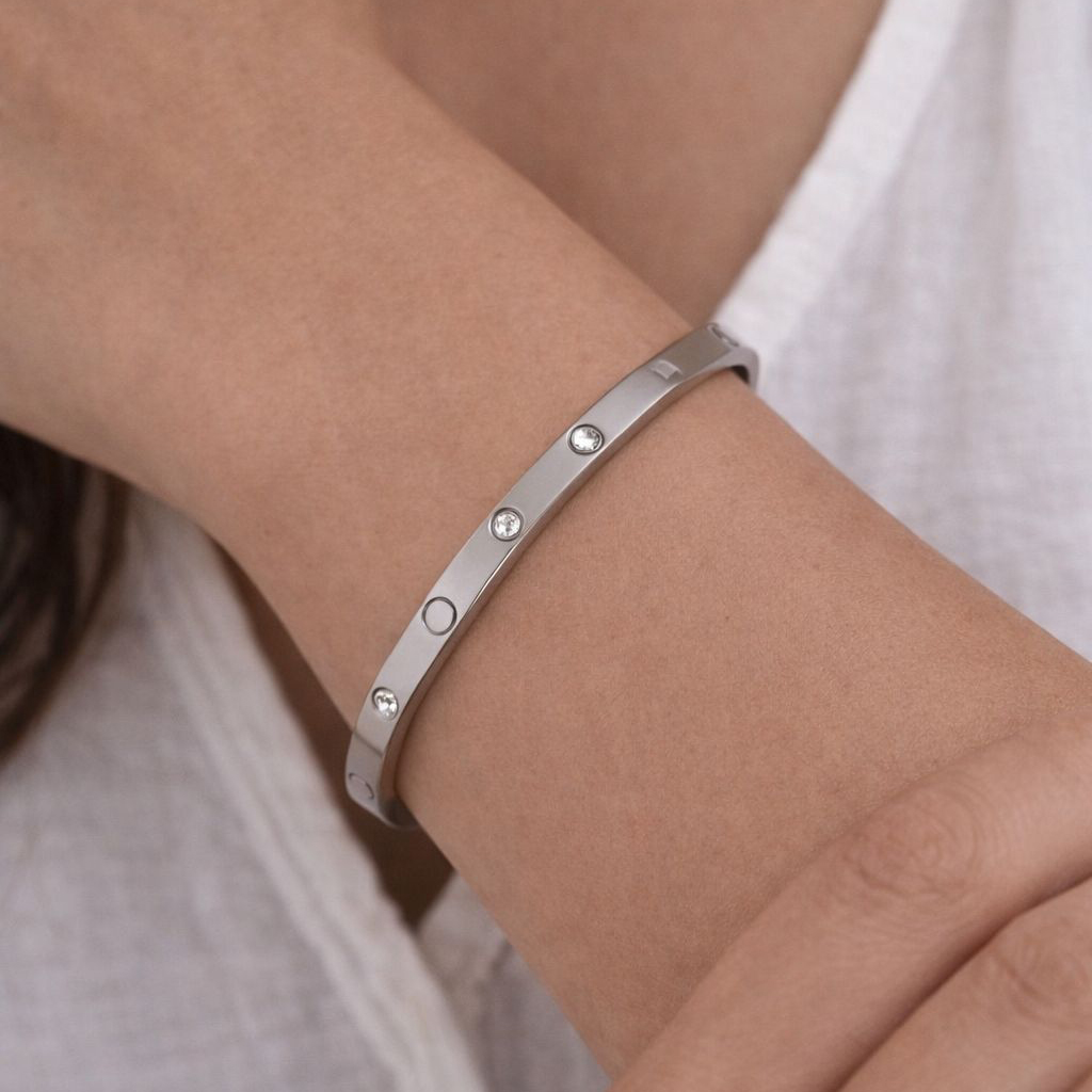 A sleek silver bangle accented with delicate crystal and signature circular detailing.