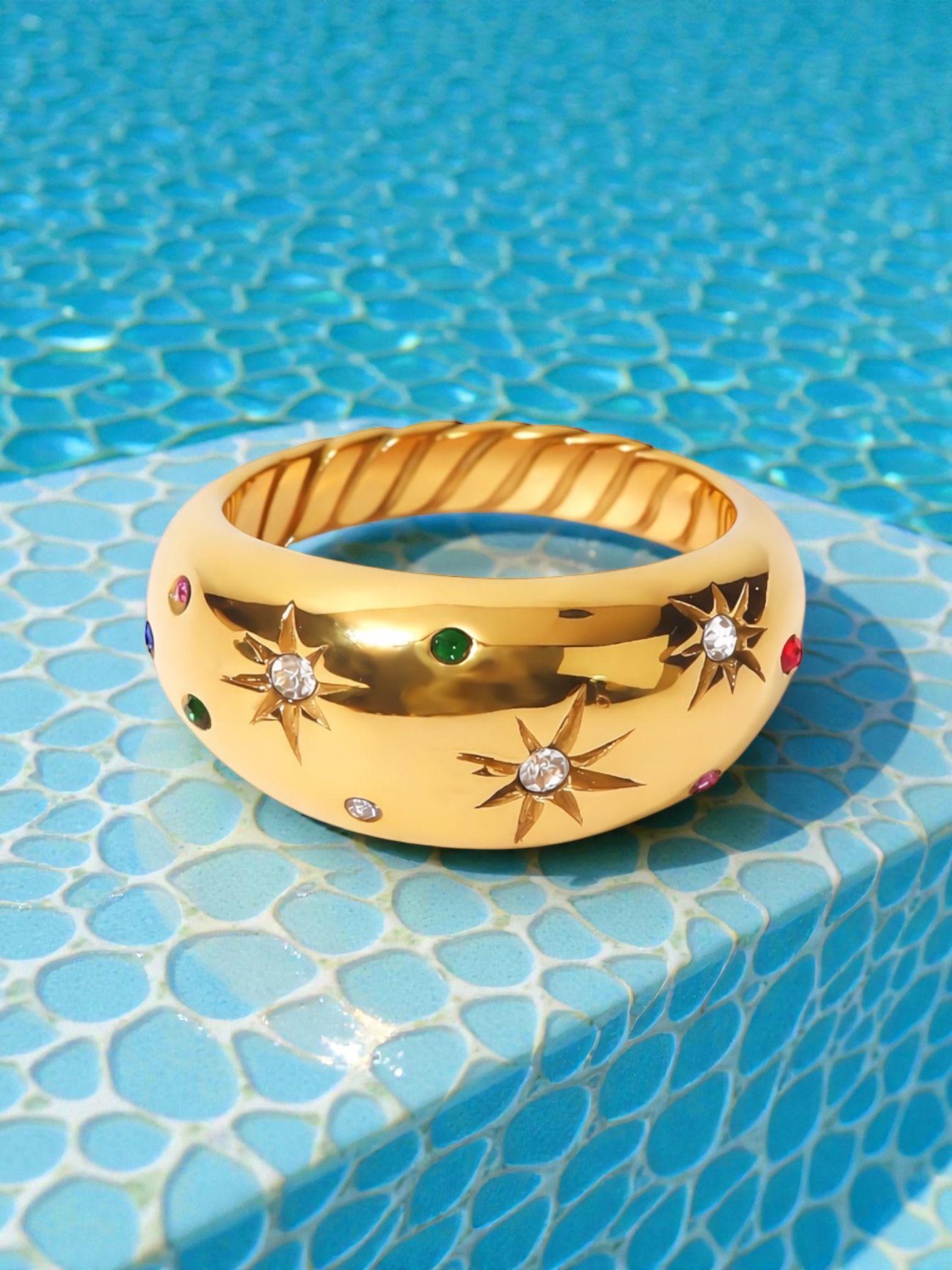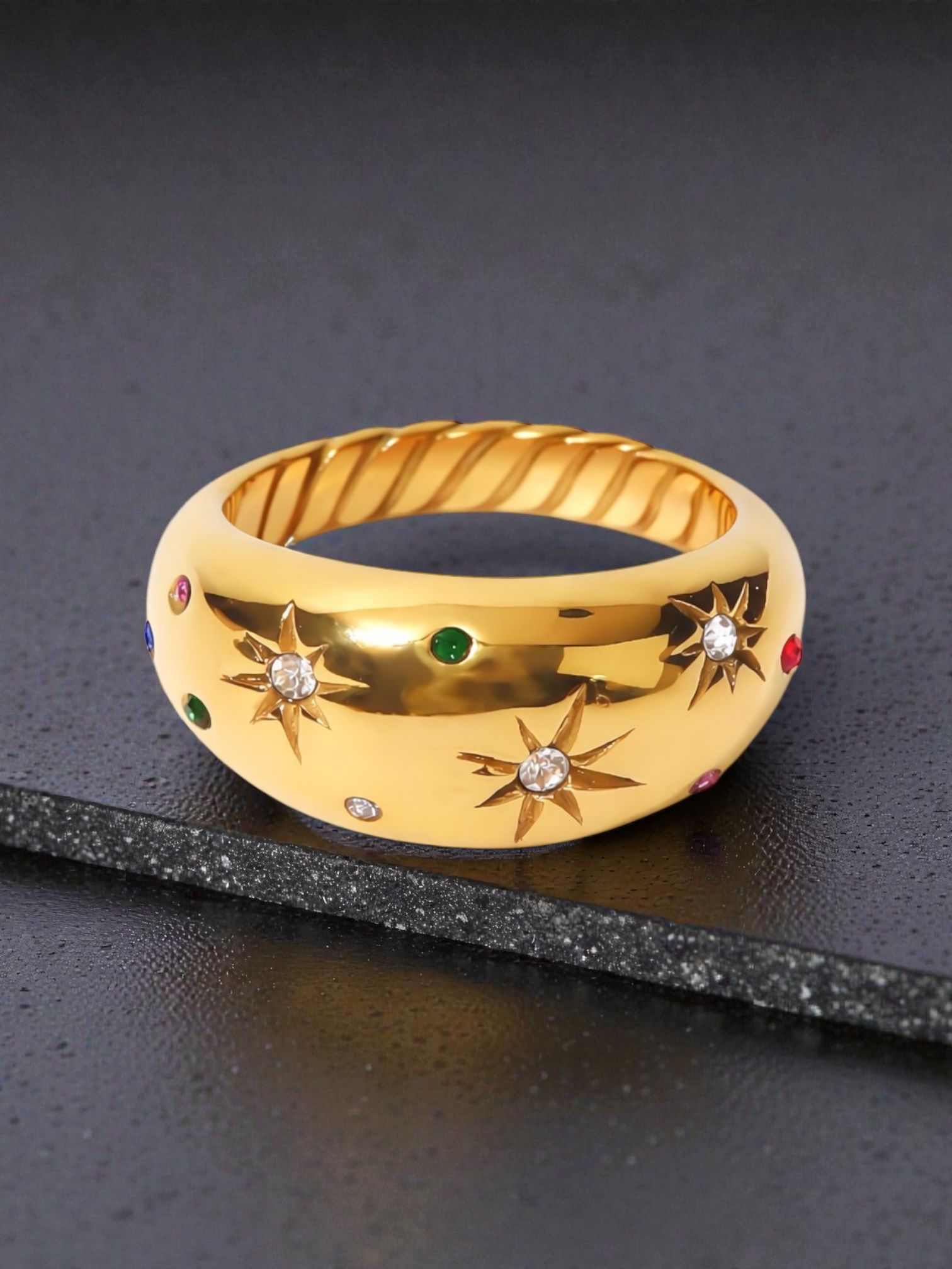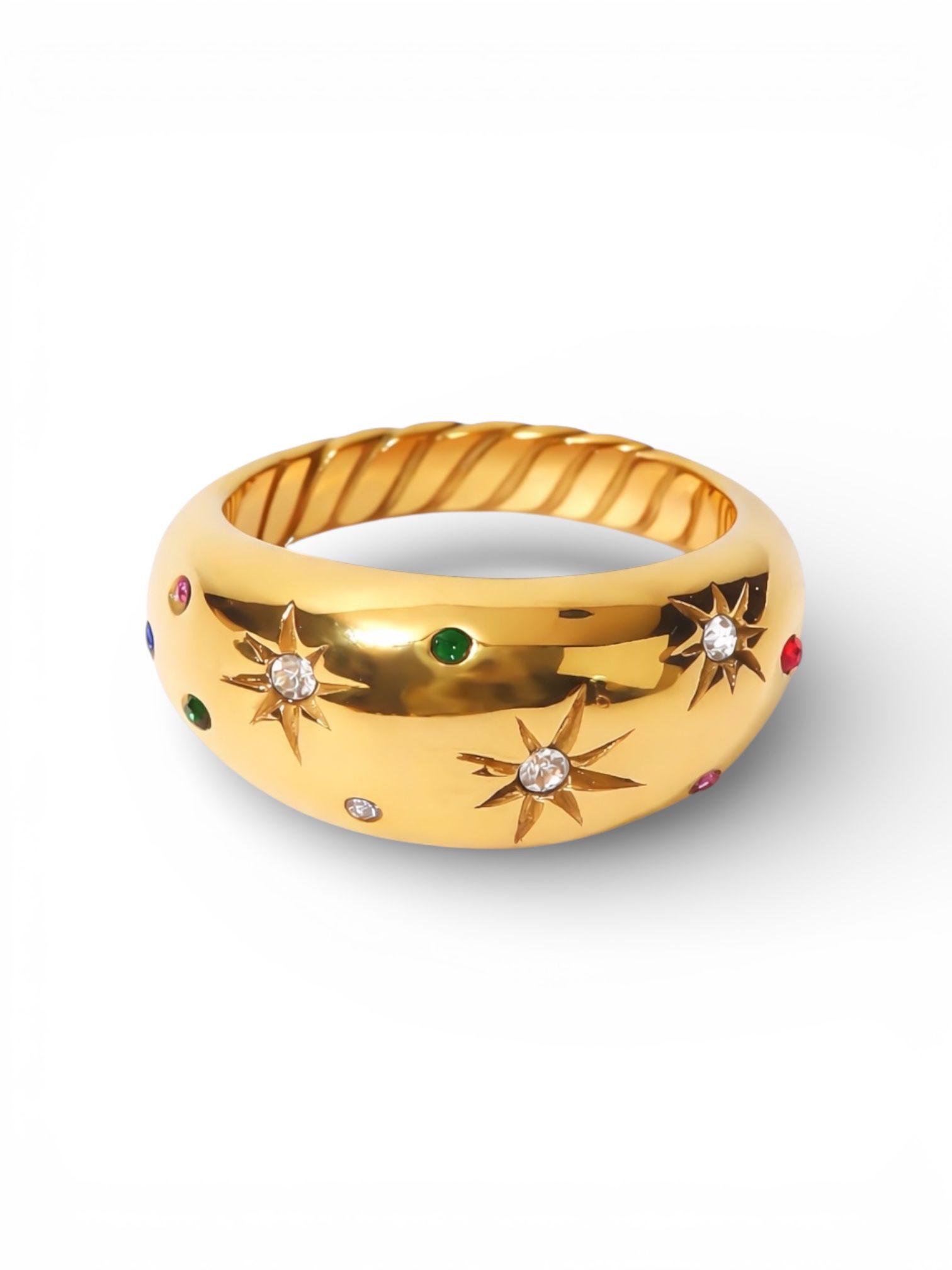 A bold gold dome ring scattered with celestial starbursts and subtle coloured stones. A statement piece designed to shine from every angle.
