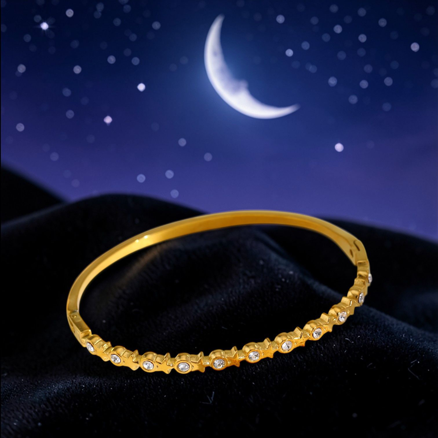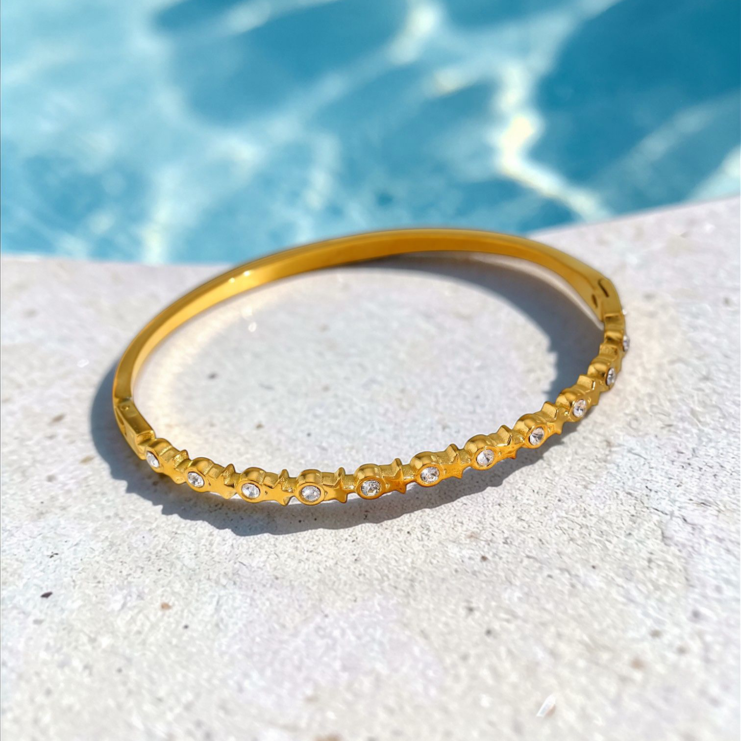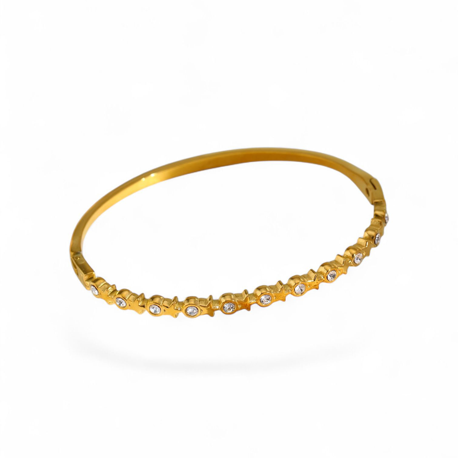 A radiant gold bangle adorned with sculpted star motifs, each finished with a delicate crystal centre for subtle sparkle.