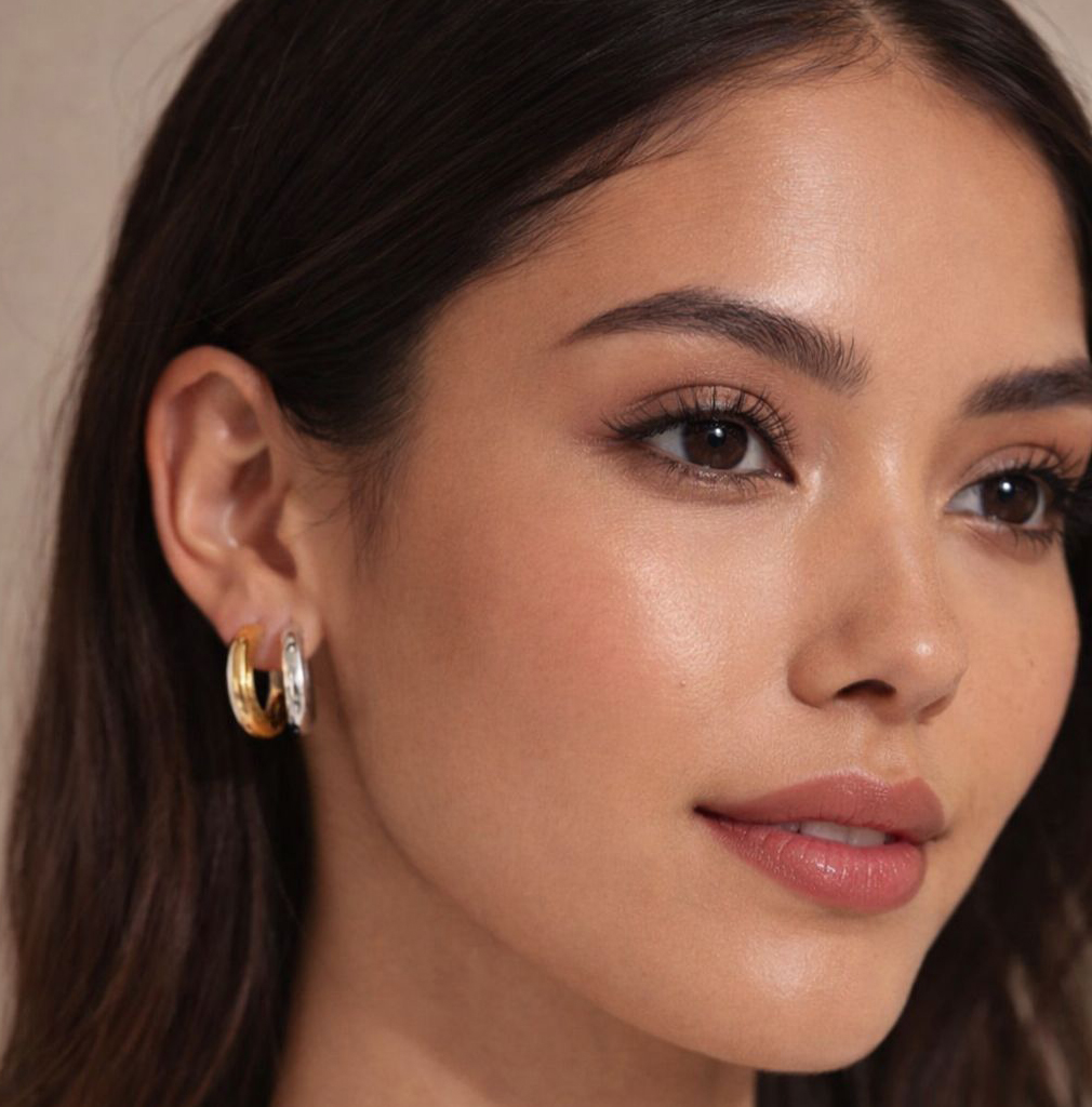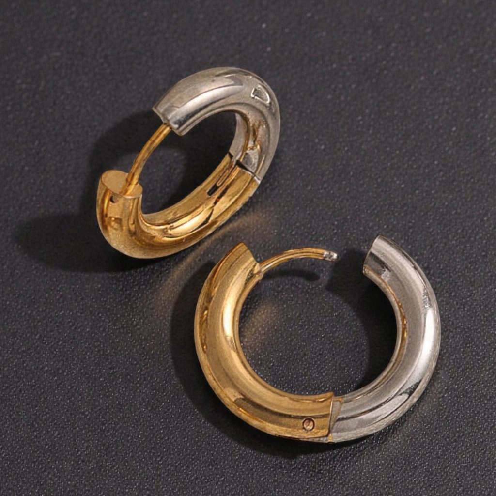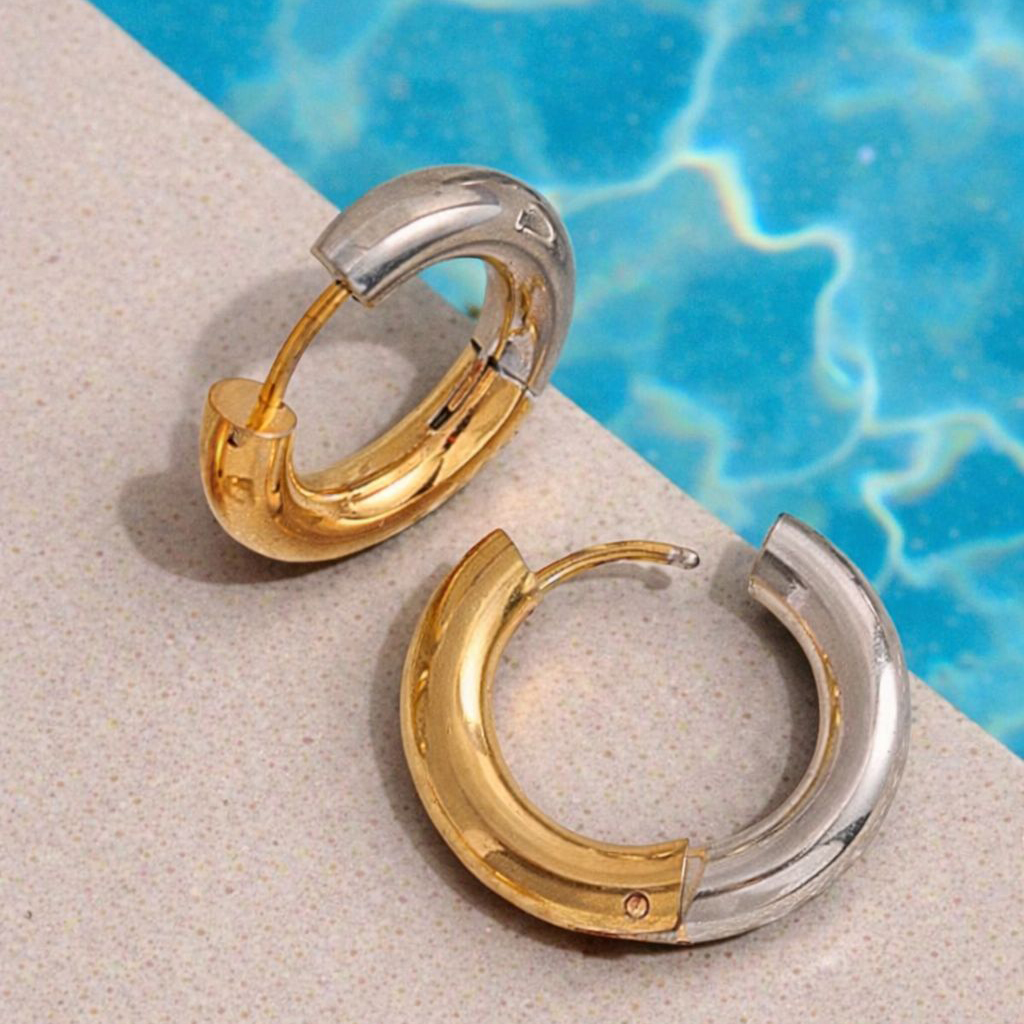 Bold two-tone hoops blending gold and silver in one sleek design. The perfect everyday statement — effortless, versatile, and made to mix.