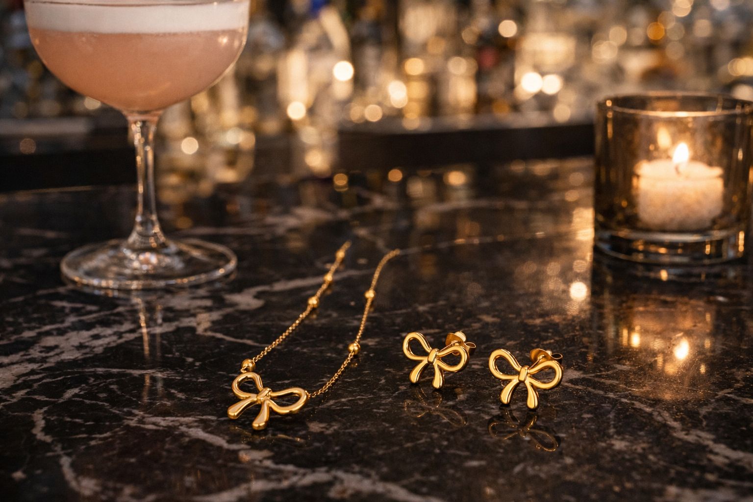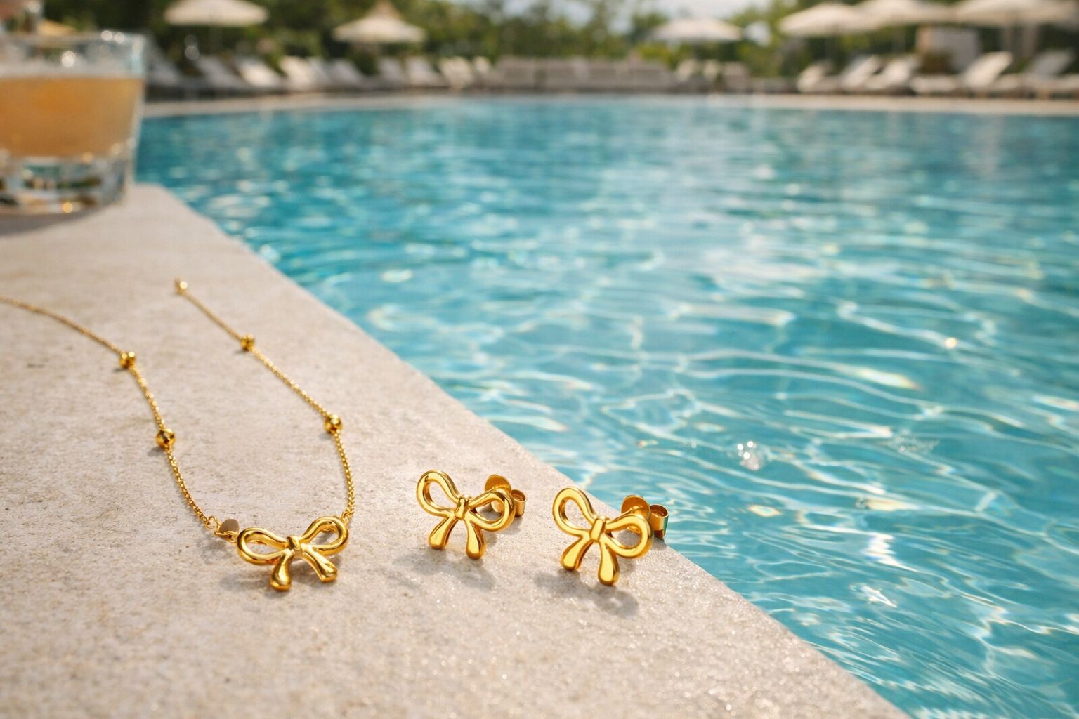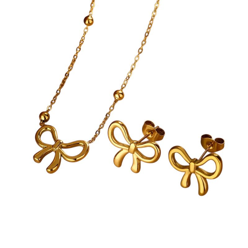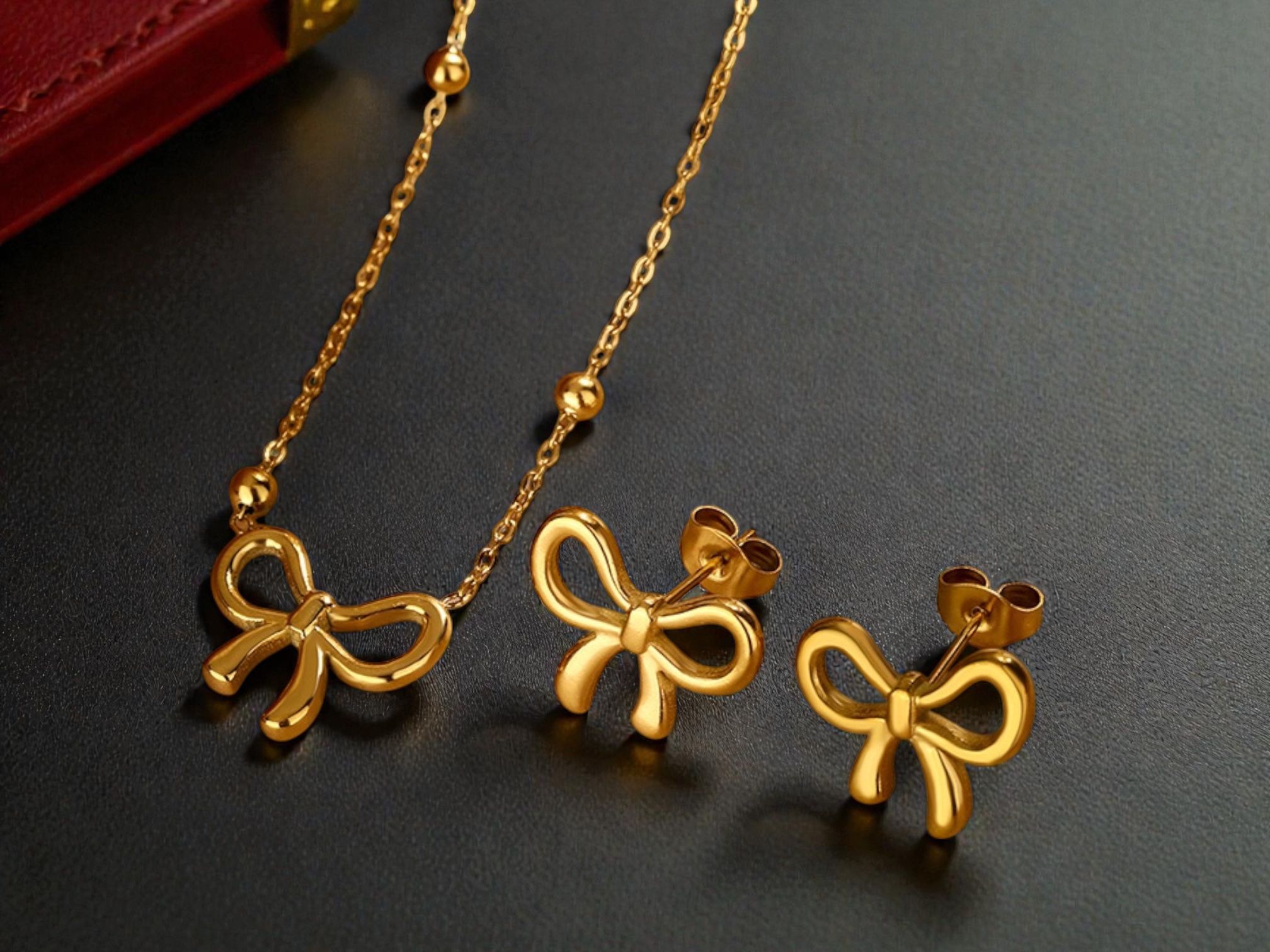 A delicate and feminine gold bow necklace and matching earrings, designed to add a soft, romantic touch to any look.