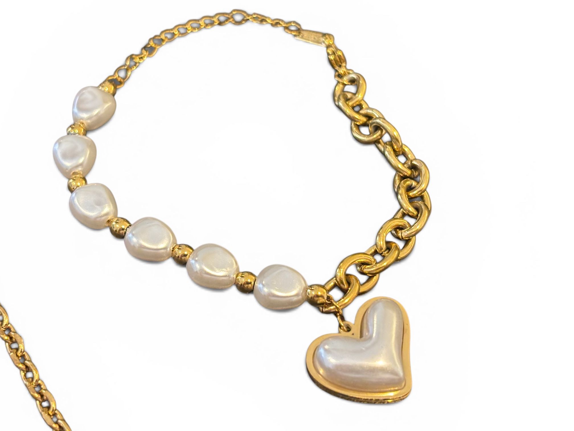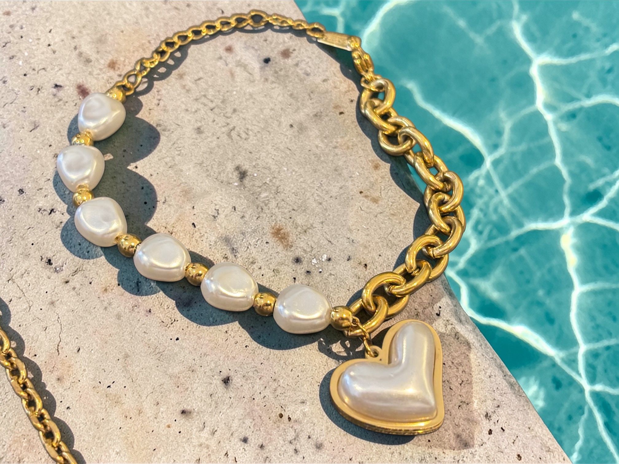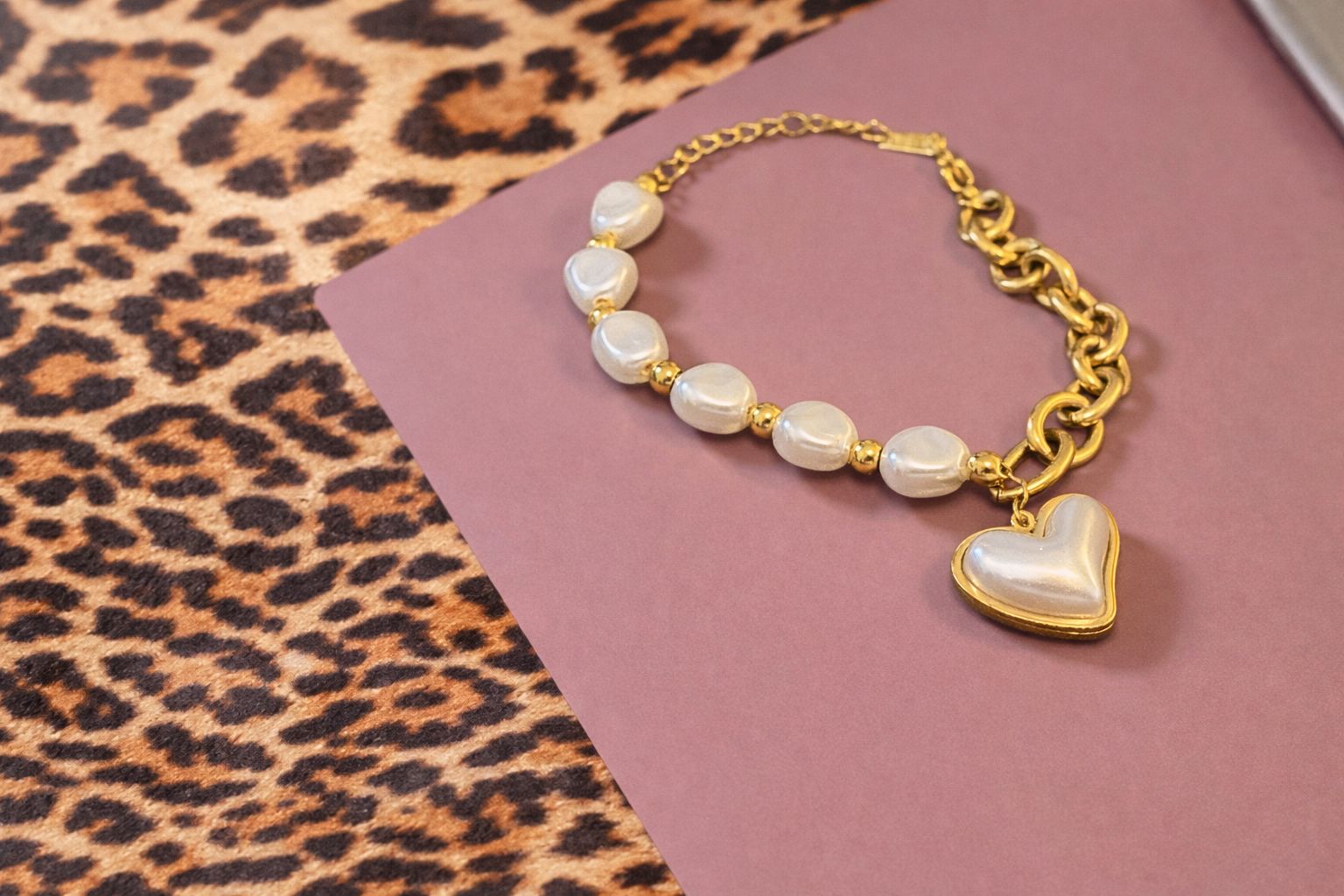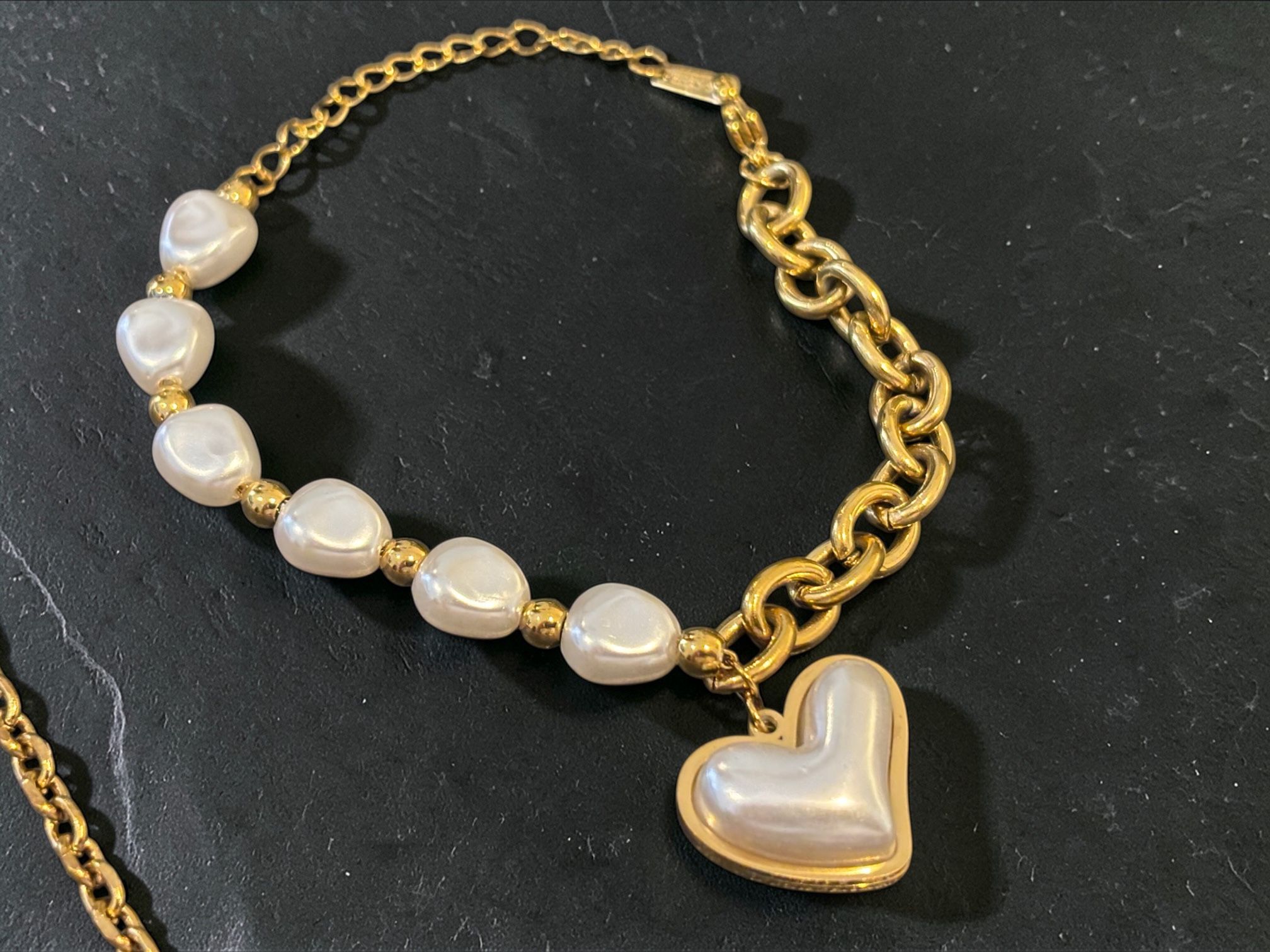 A modern take on timeless romance — this pearl heart bracelet blends soft elegance with bold gold detail. Featuring a row of luminous, organic-shaped pearls paired with a statement gold chain, the design is finished with a glowing heart charm that adds a feminine, eye-catching touch.