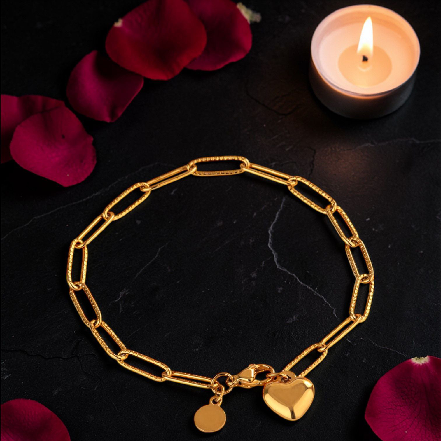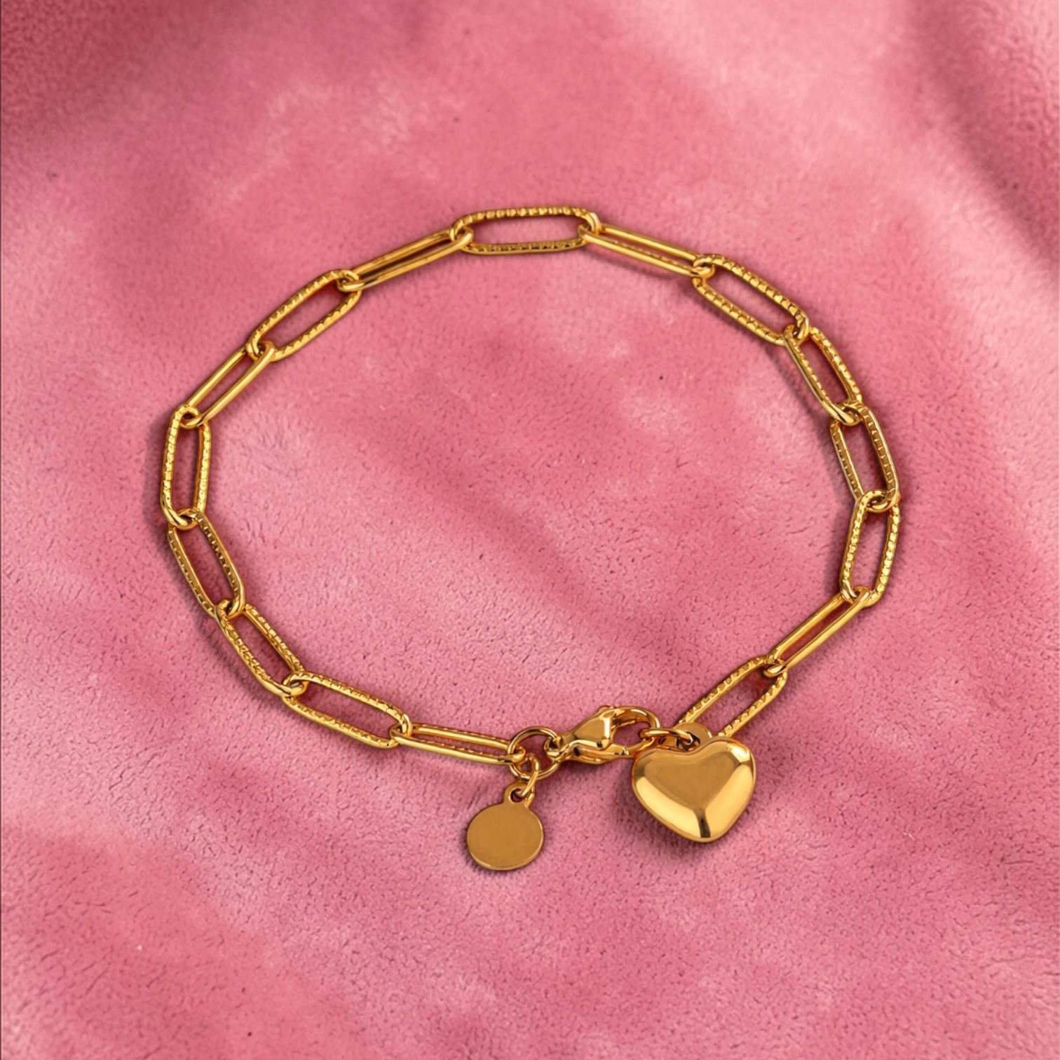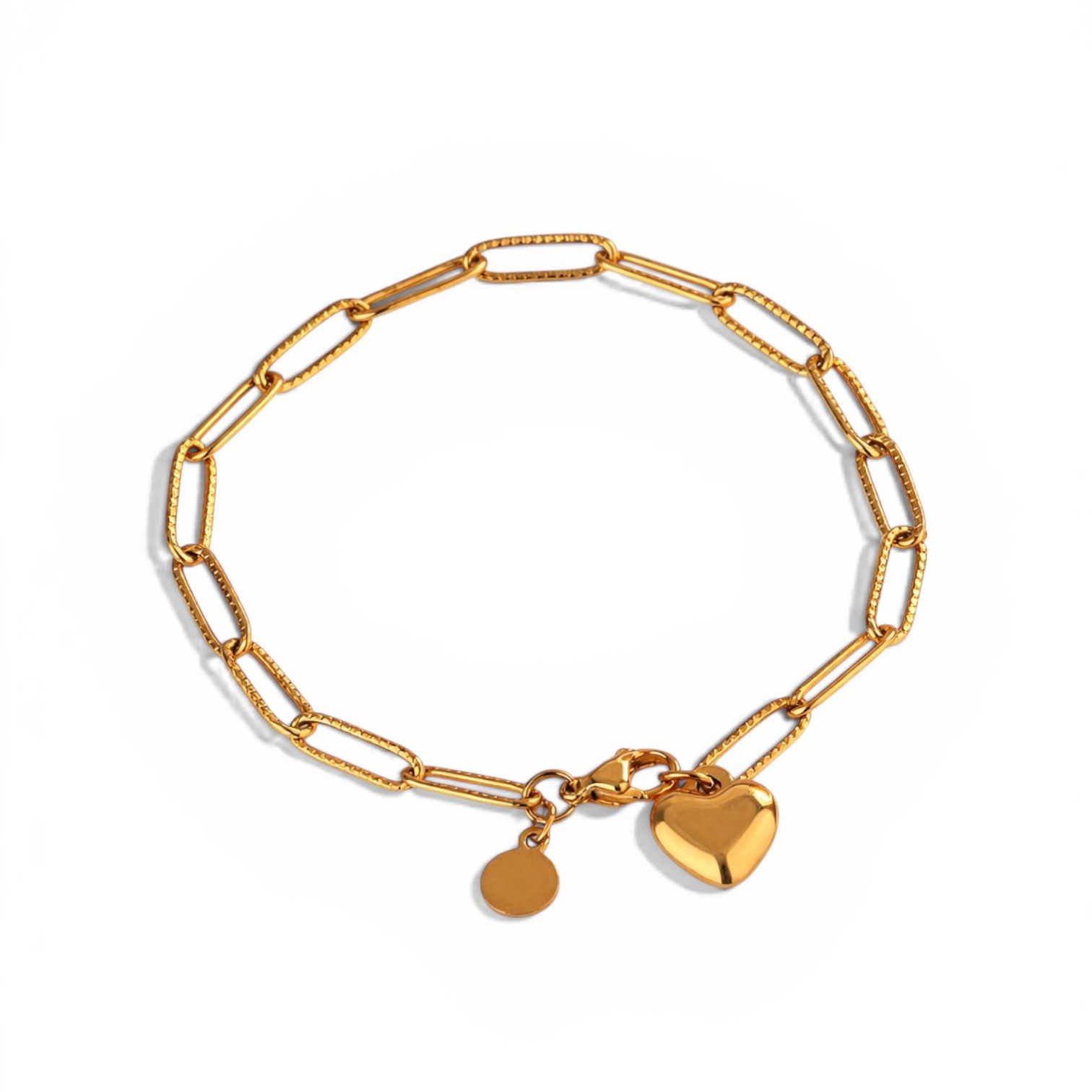 The Luna Link Heart Bracelet is a modern, everyday statement pairing featuring a bold elongated paperclip chain bracelet, finished with a polished puff heart charm and signature mini disc detail.
