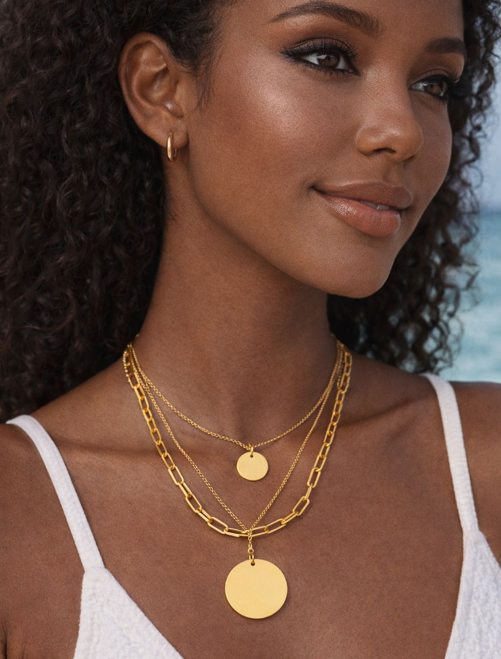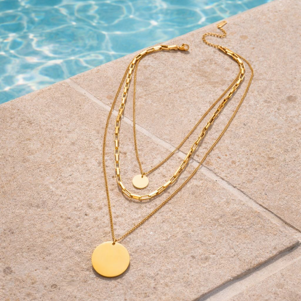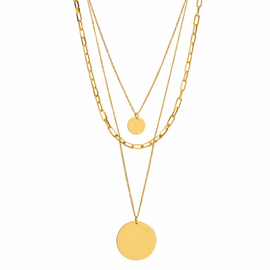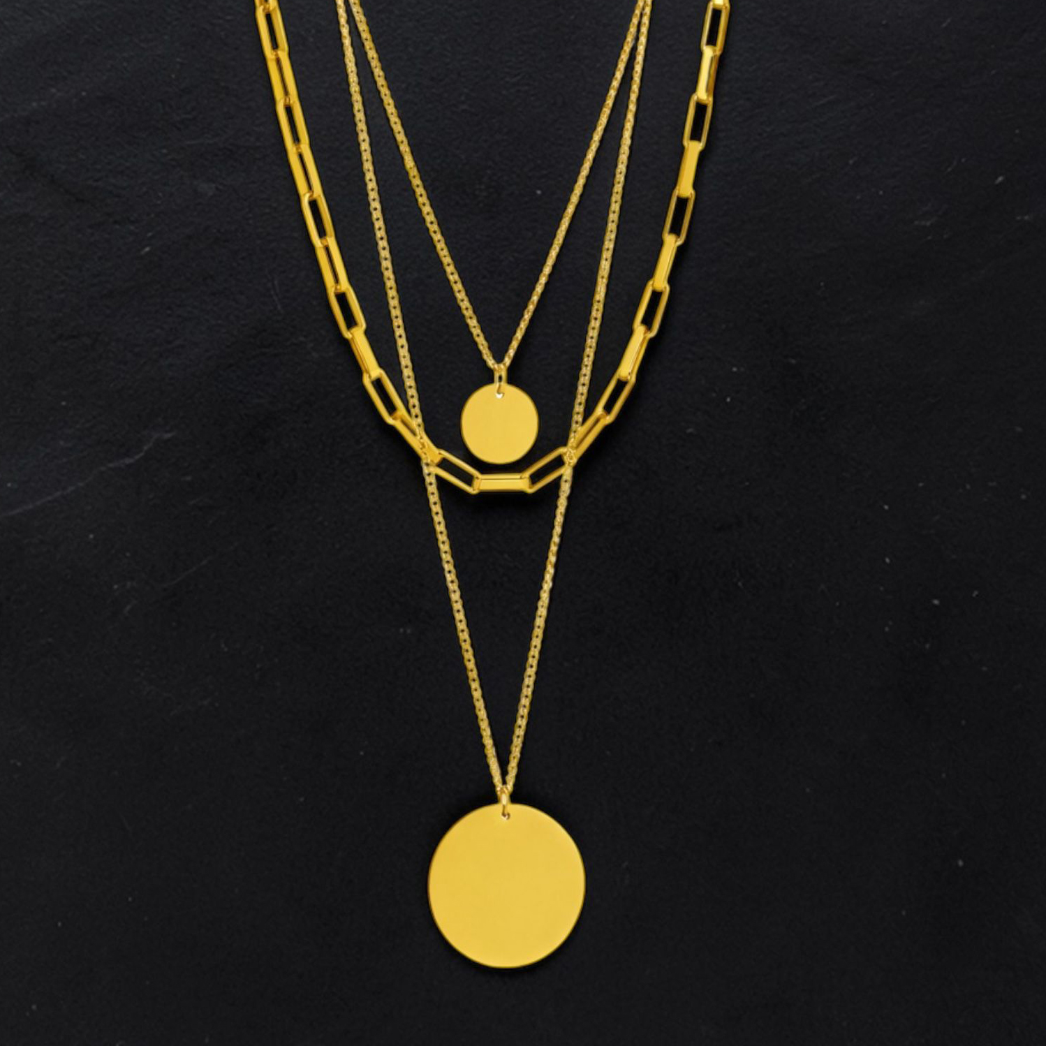 Effortlessly chic and designed to make a statement, the Luxe Sol Layered Necklace features three perfectly balanced gold chains in a ready-styled stack. A bold paperclip chain adds modern edge, while two delicate fine chains soften the look with subtle elegance. Finished with two polished gold disc pendants, this piece catches the light beautifully with every movement.