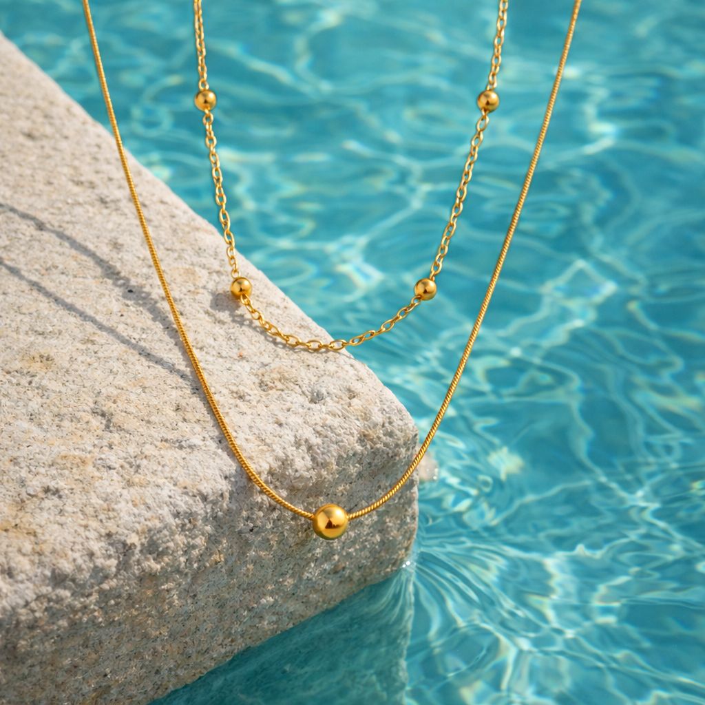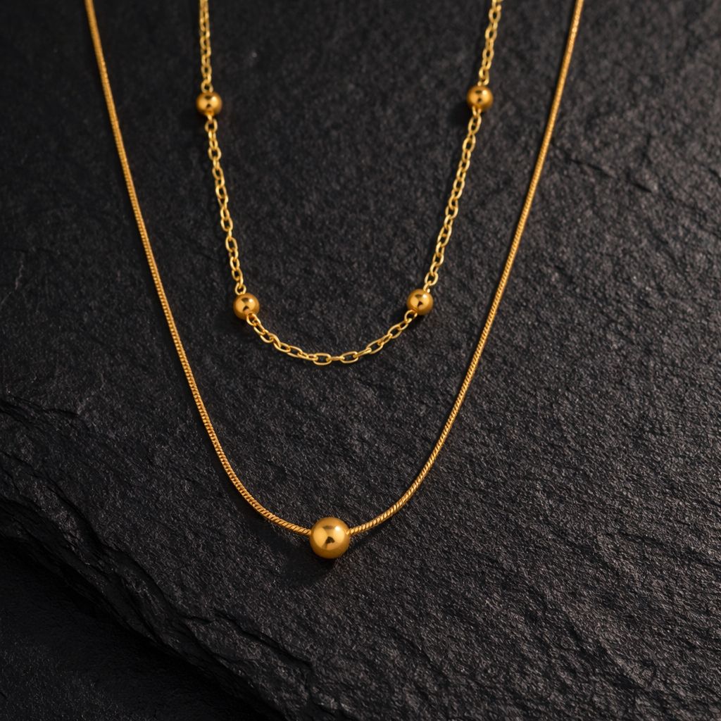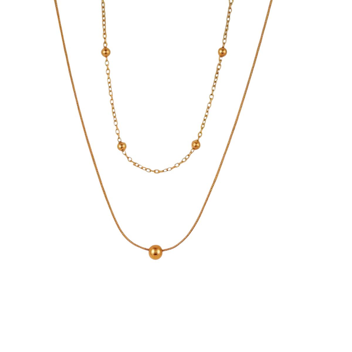 A refined double-layer gold necklace featuring delicate chains and polished sphere accents for effortless dimension.