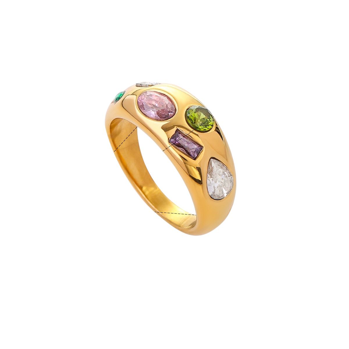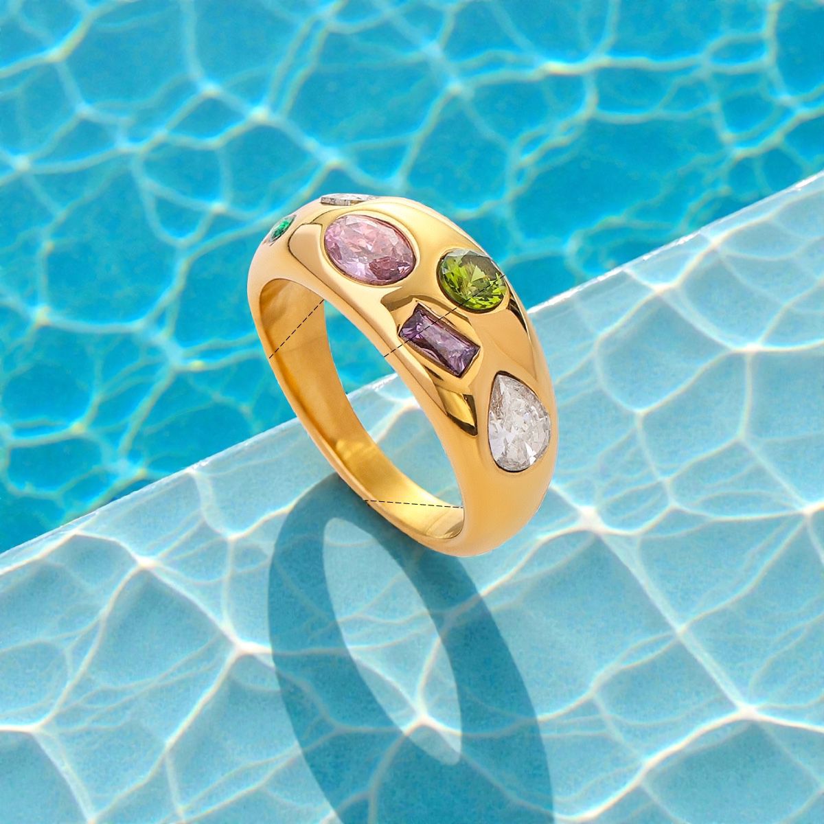 A statement gold band set with vibrant mixed-cut stones in rich jewel tones. Playful, confident and made to stand out.