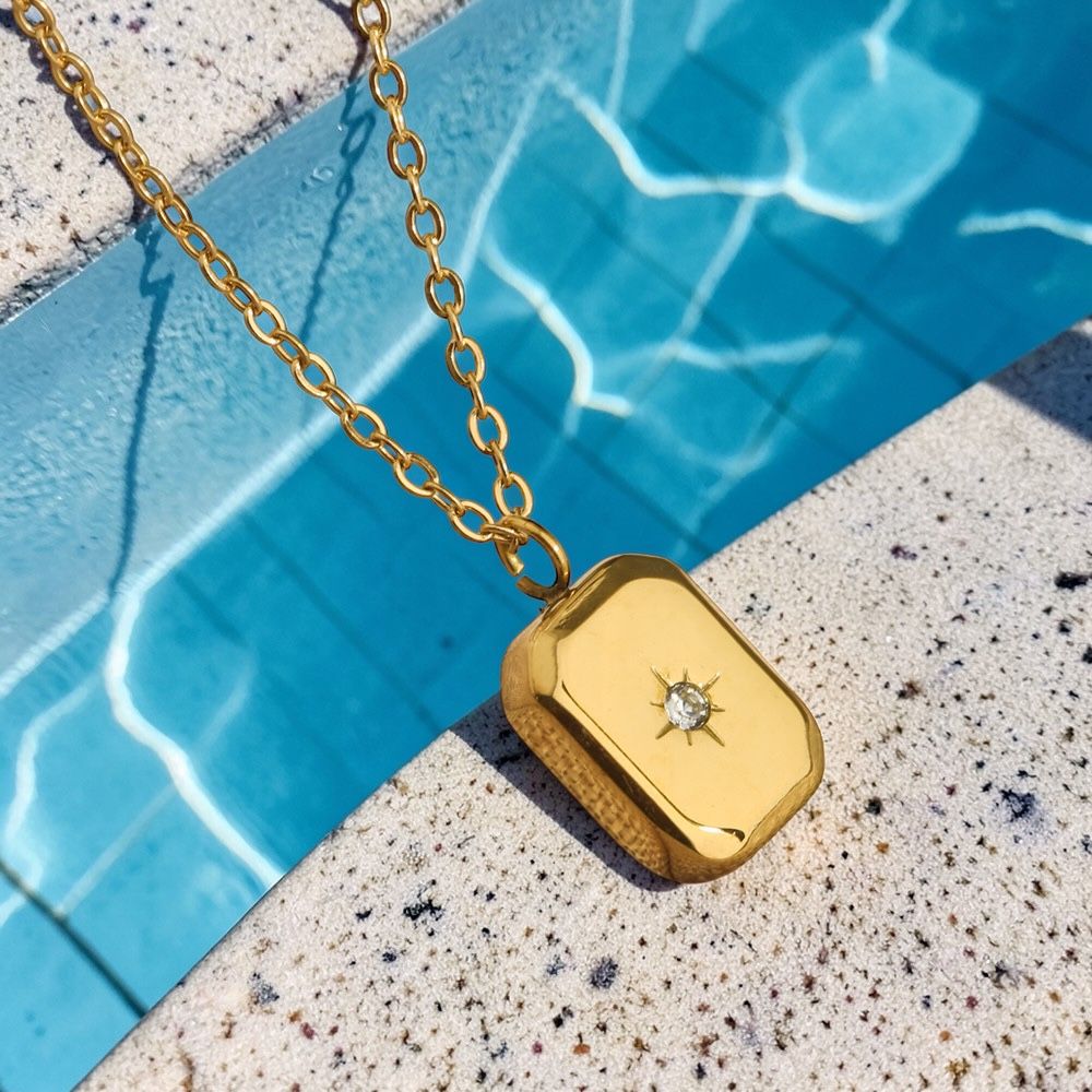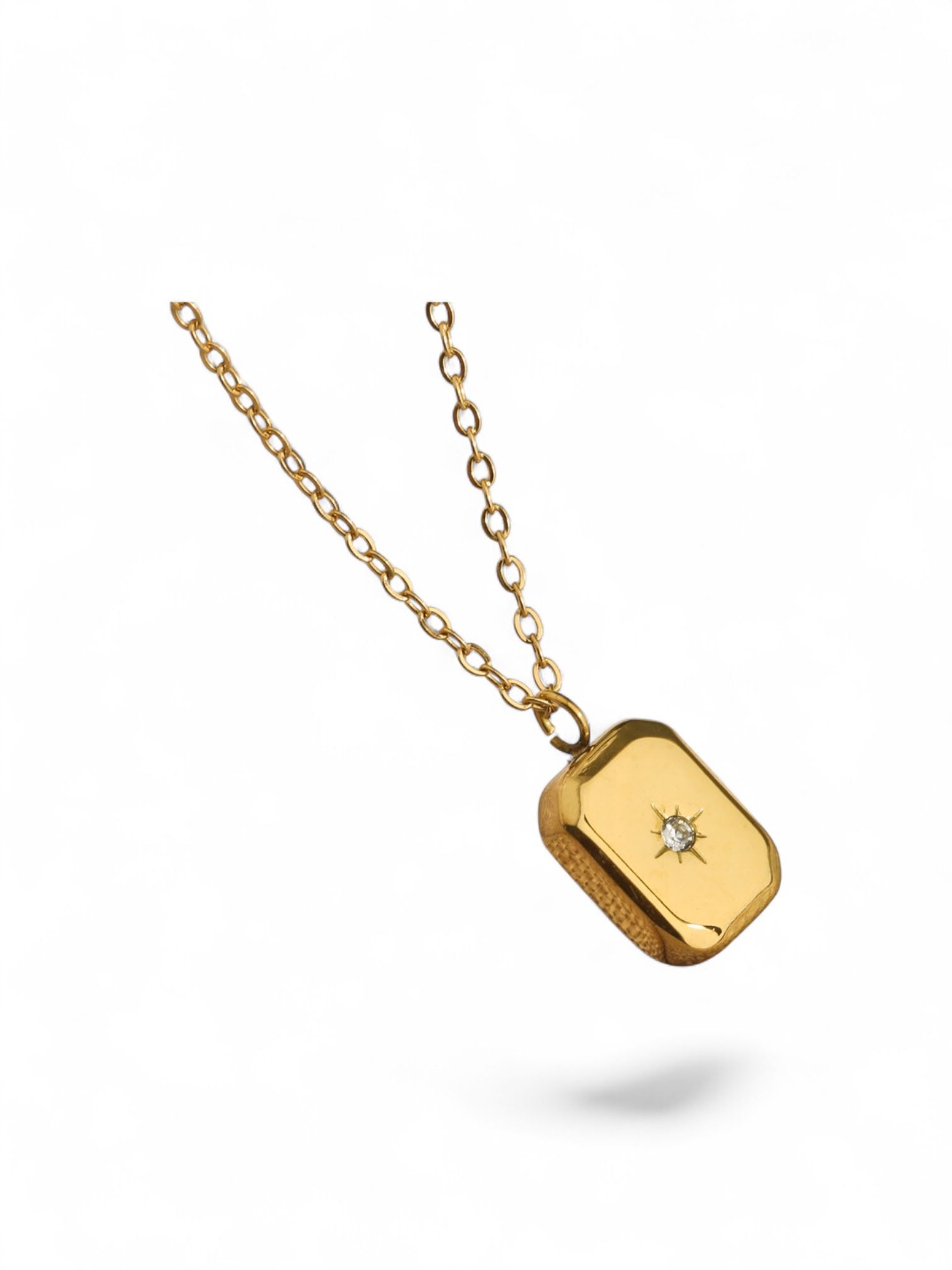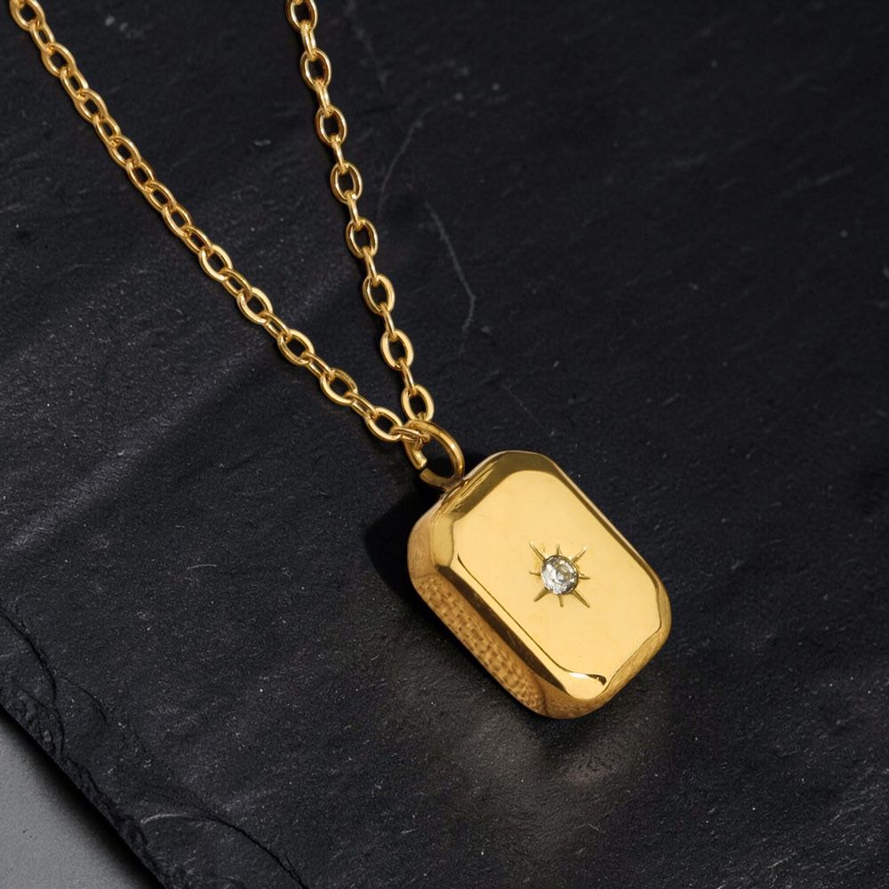A polished gold rectangular tag pendant featuring a delicate starburst-set crystal at its centre.
