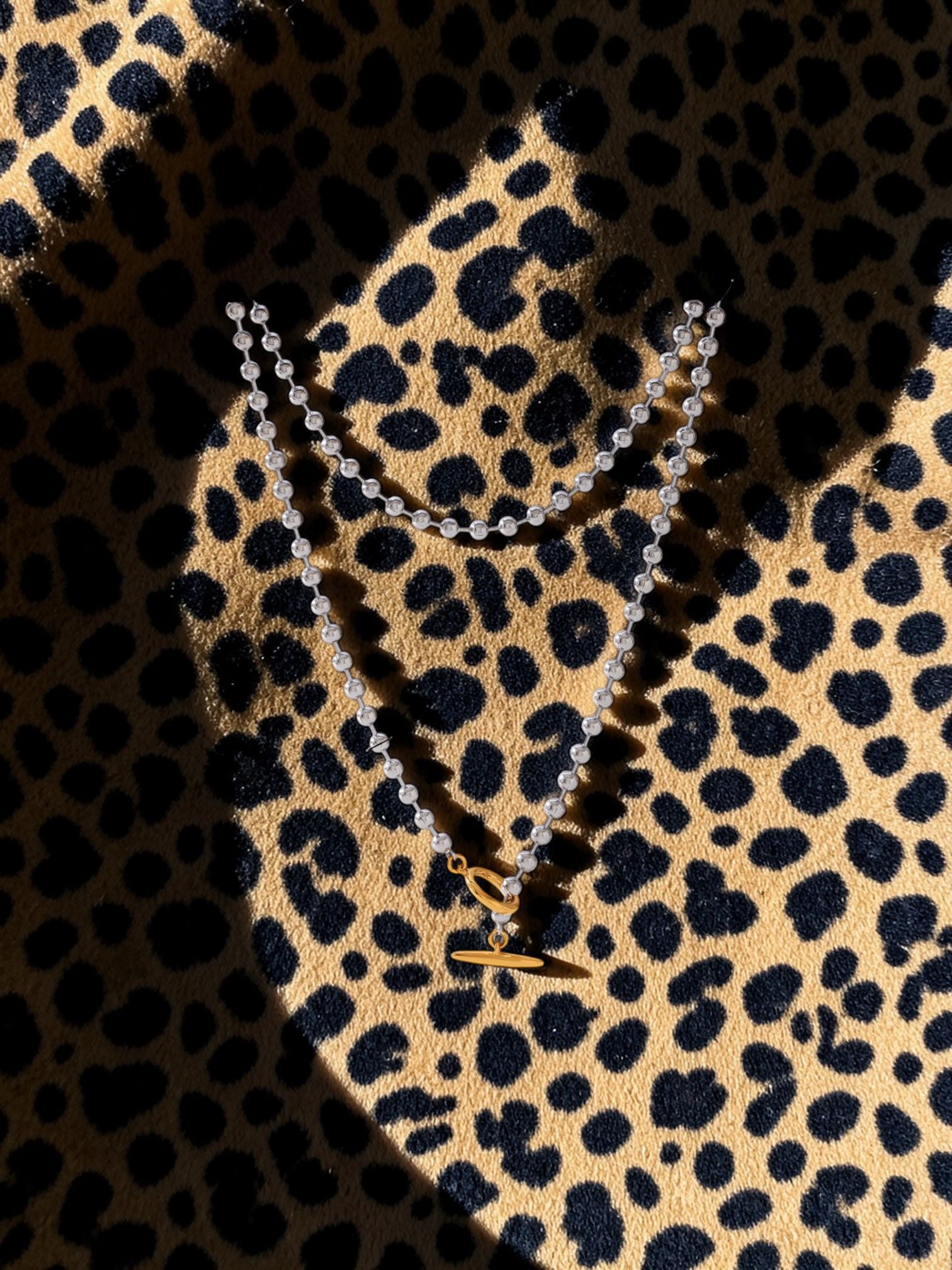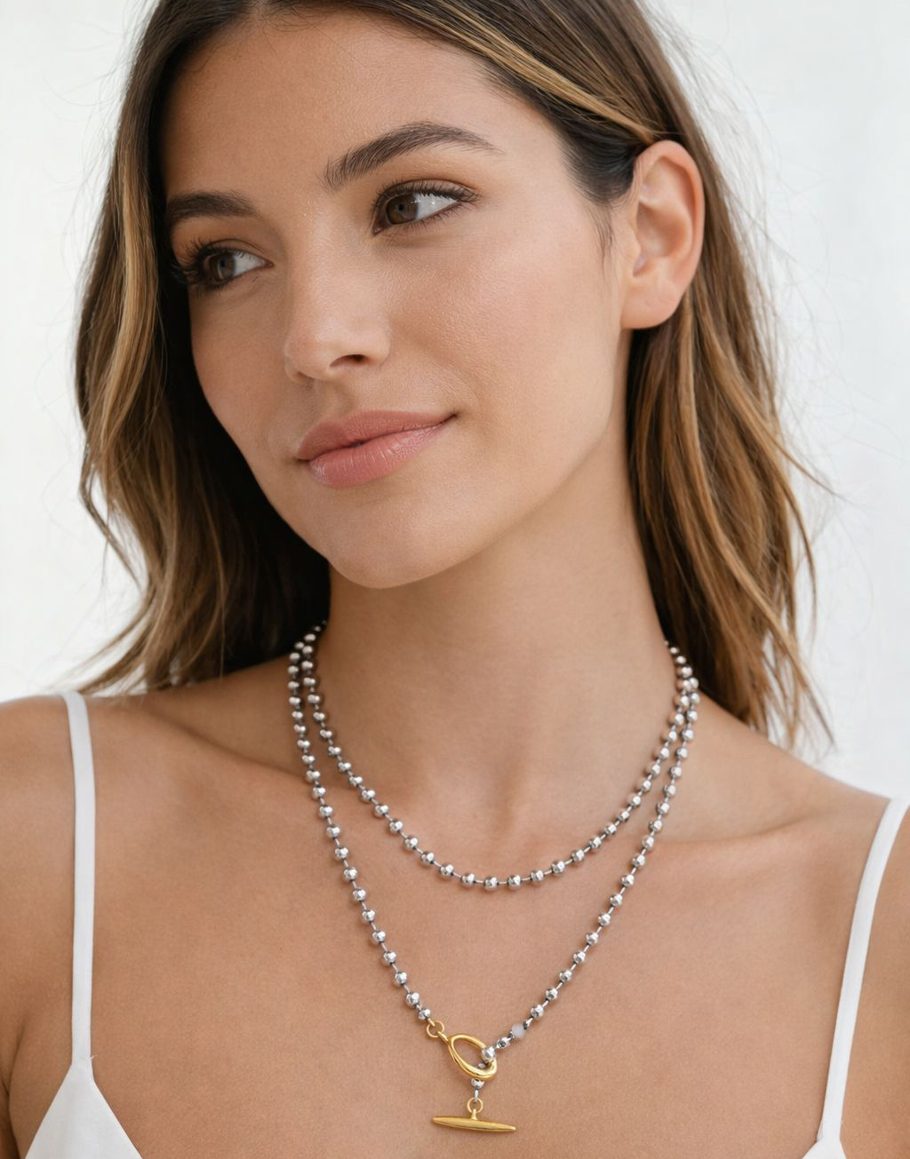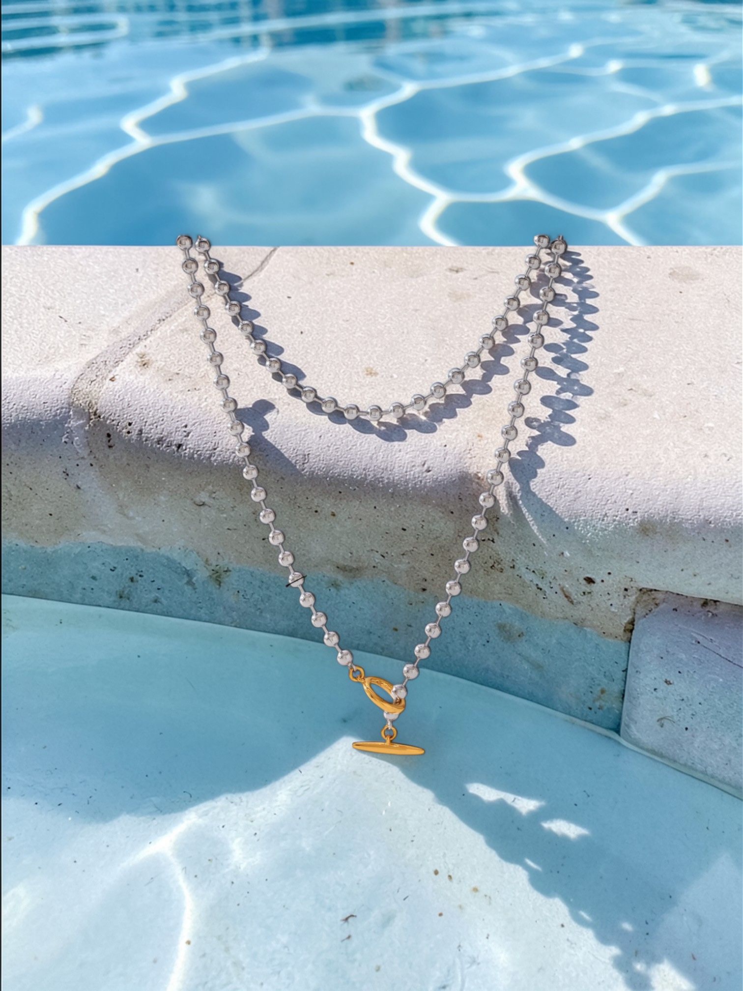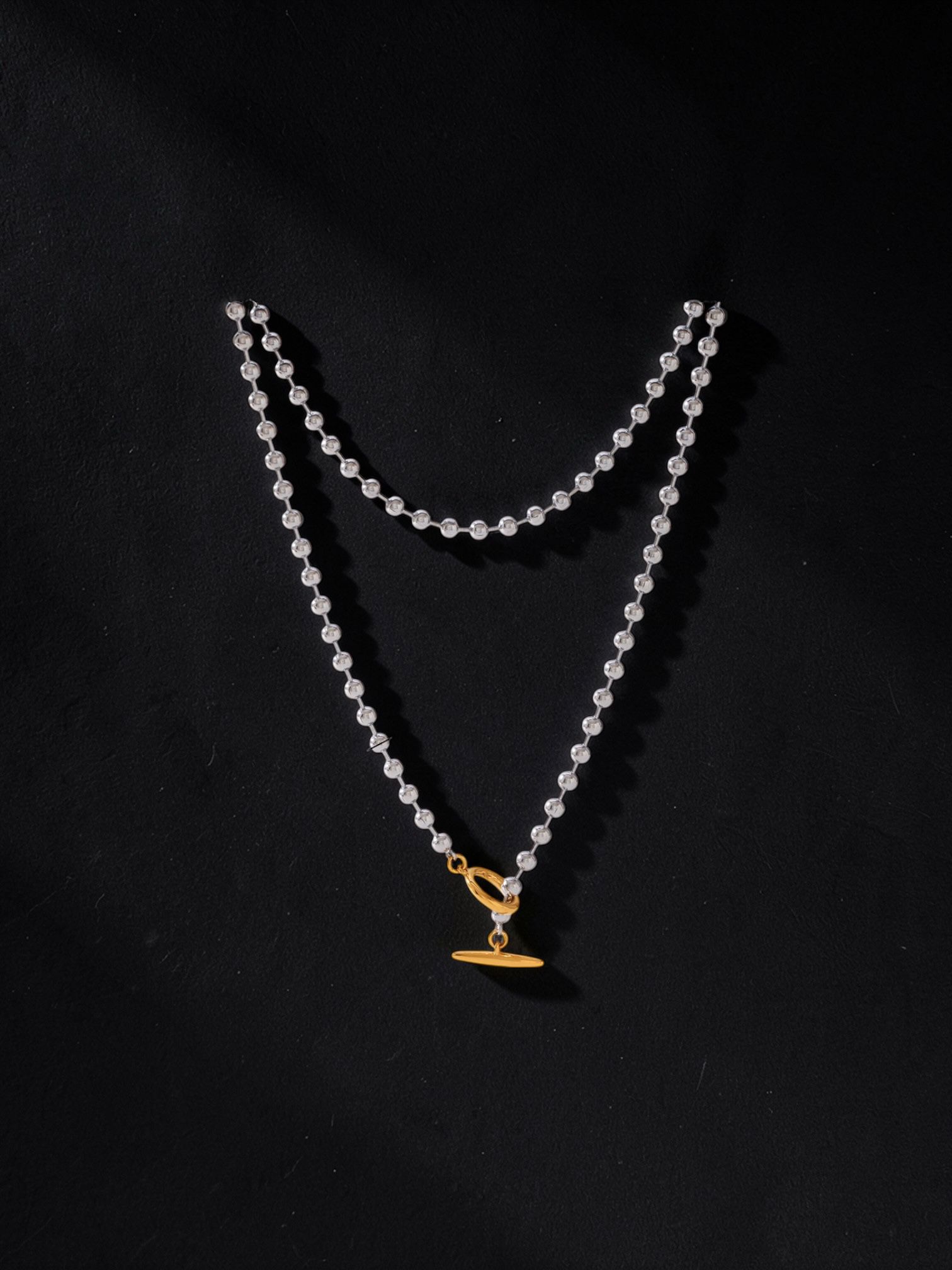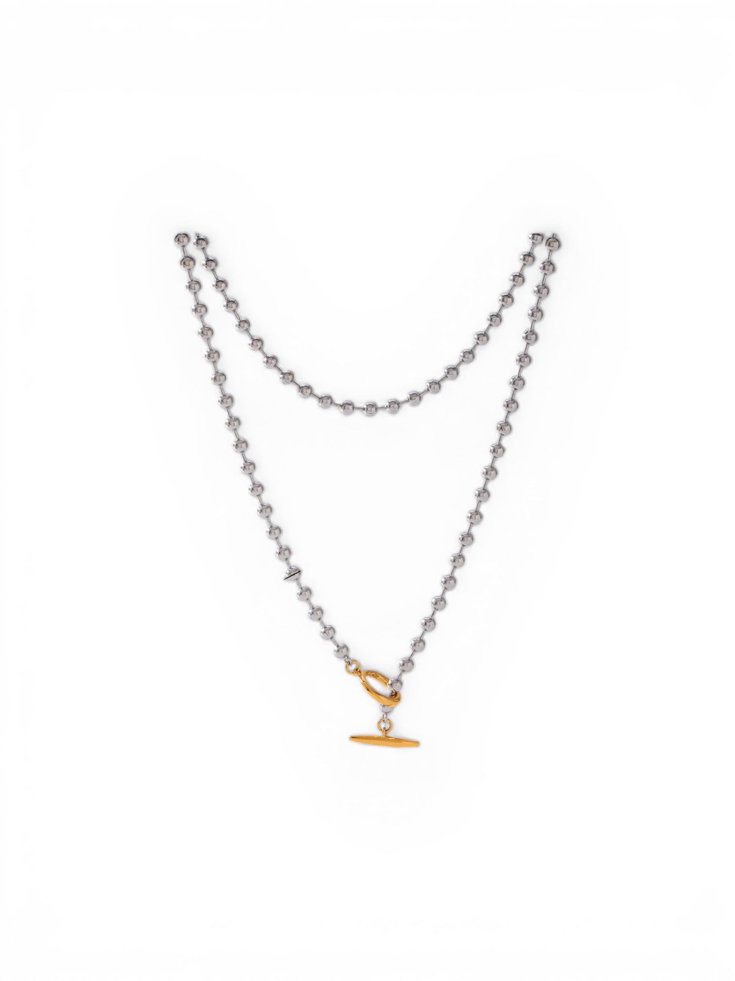 A bold yet effortless statement piece featuring a polished silver-tone 5mm ball chain with a contrasting gold toggle clasp detail at the front.