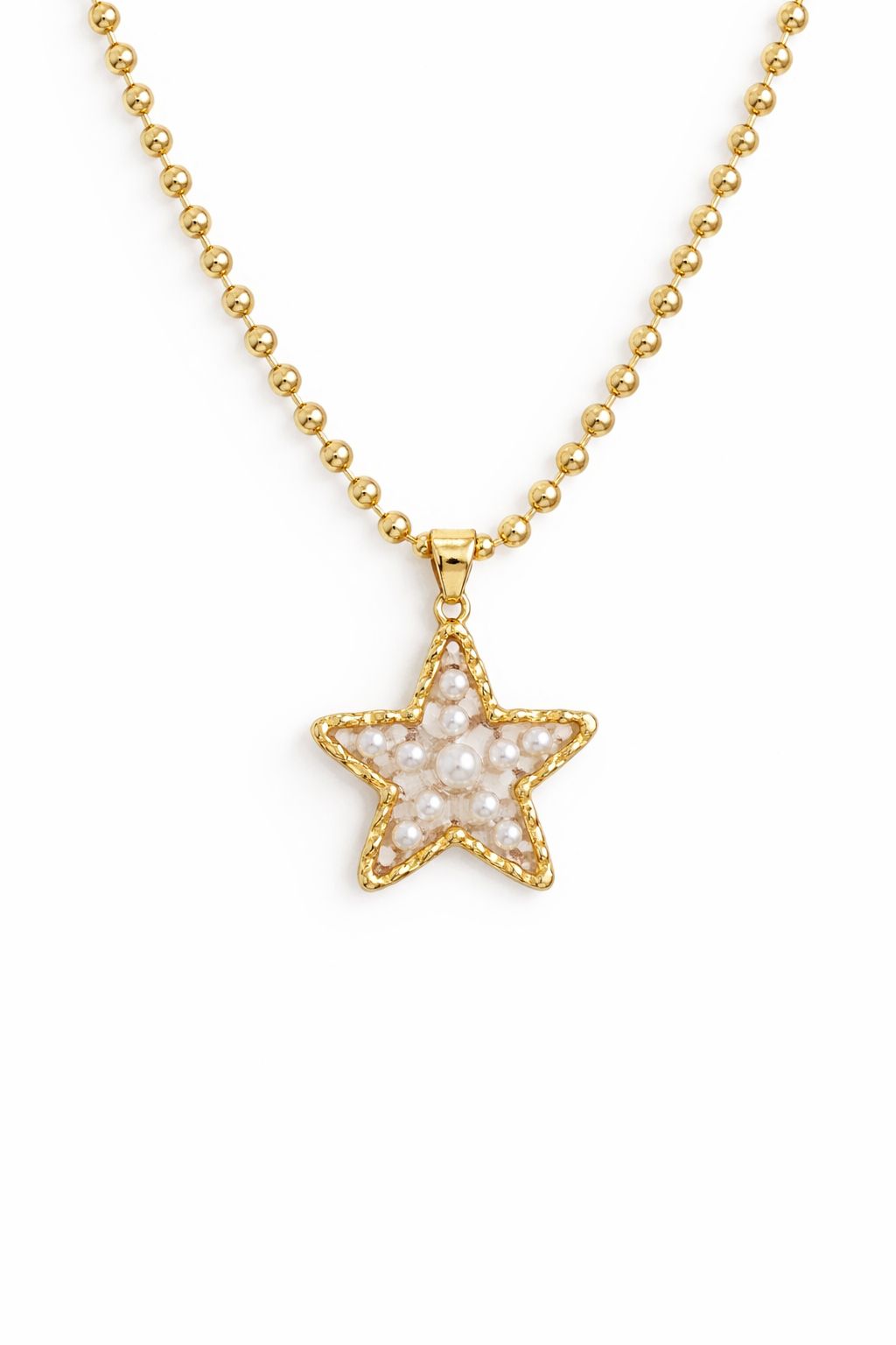 A statement gold beaded necklace featuring a textured star pendant adorned with luminous pearls. Bold yet feminine, this eye-catching piece adds a touch of celestial glamour and elevated shine to both everyday styling and special occasions.
