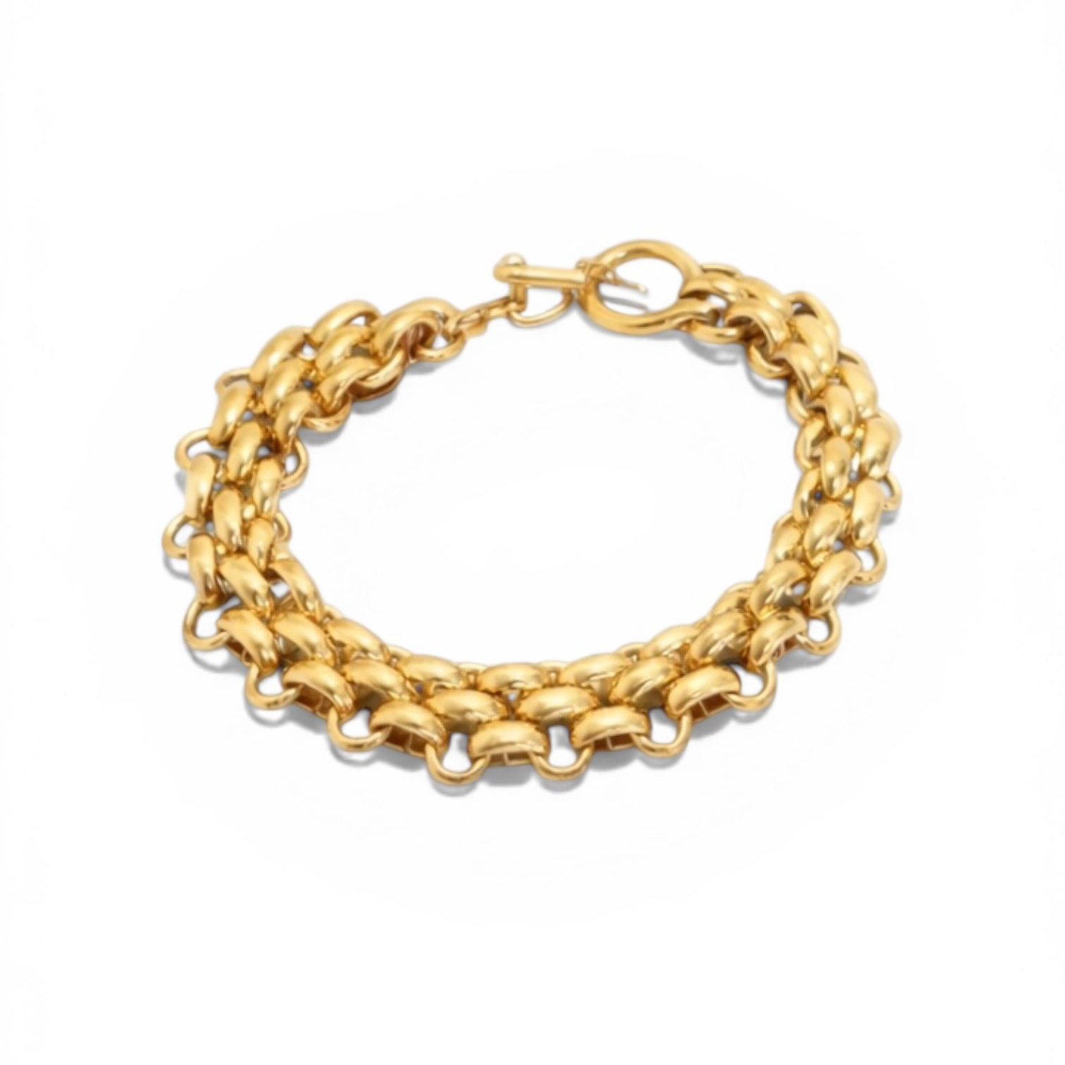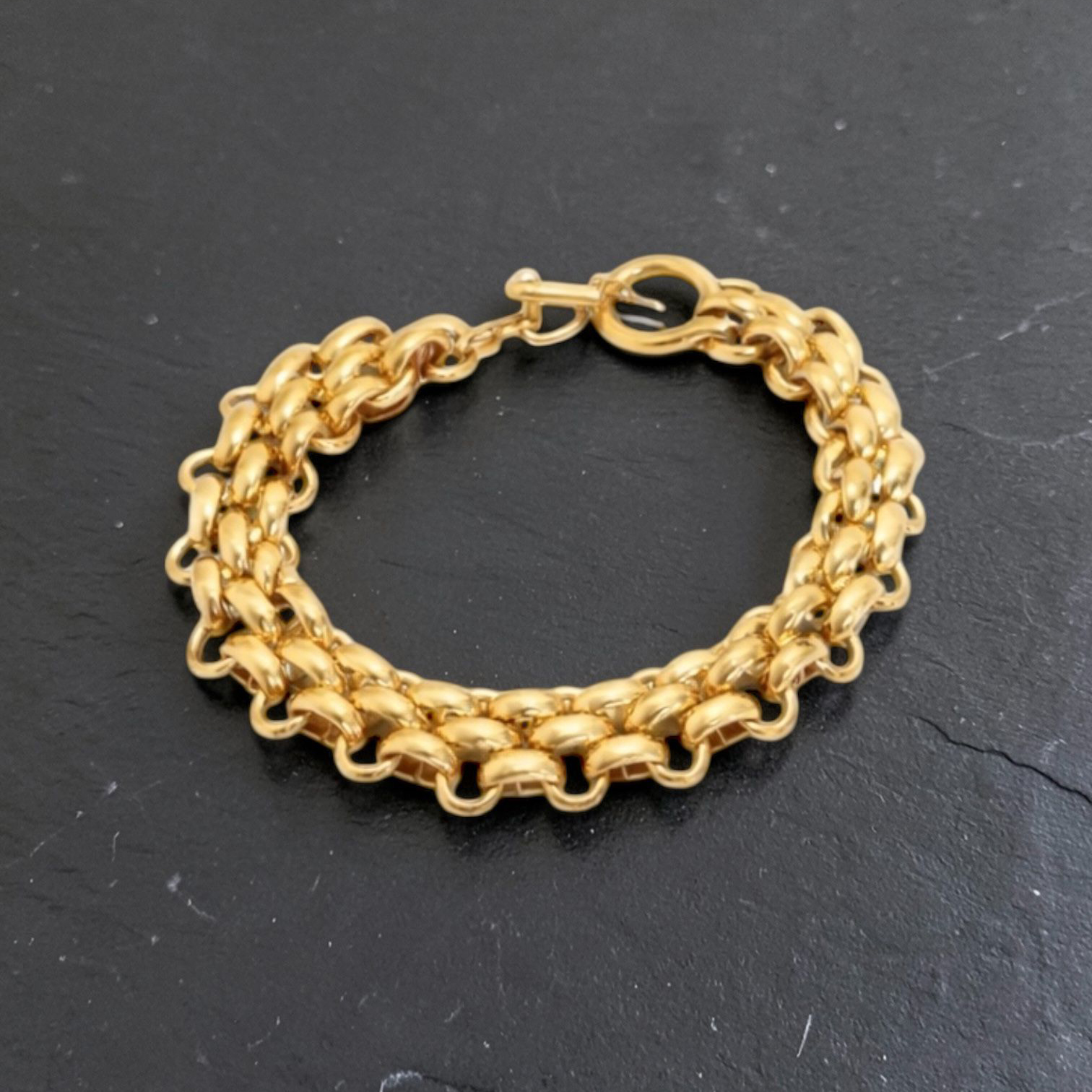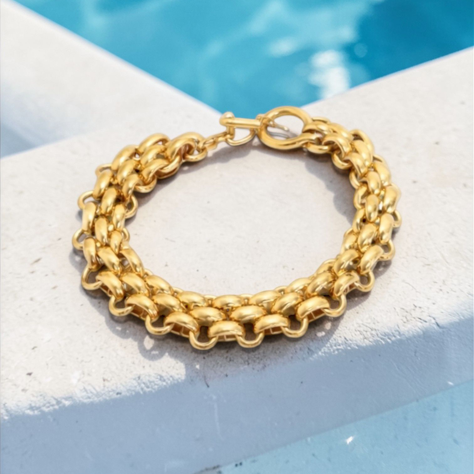 The Ruby Blue London Power Link Bracelet is designed for women who love bold, confident style with a touch of effortless glamour. This striking bracelet features beautifully textured interlocking gold links that create a powerful yet elegant statement.