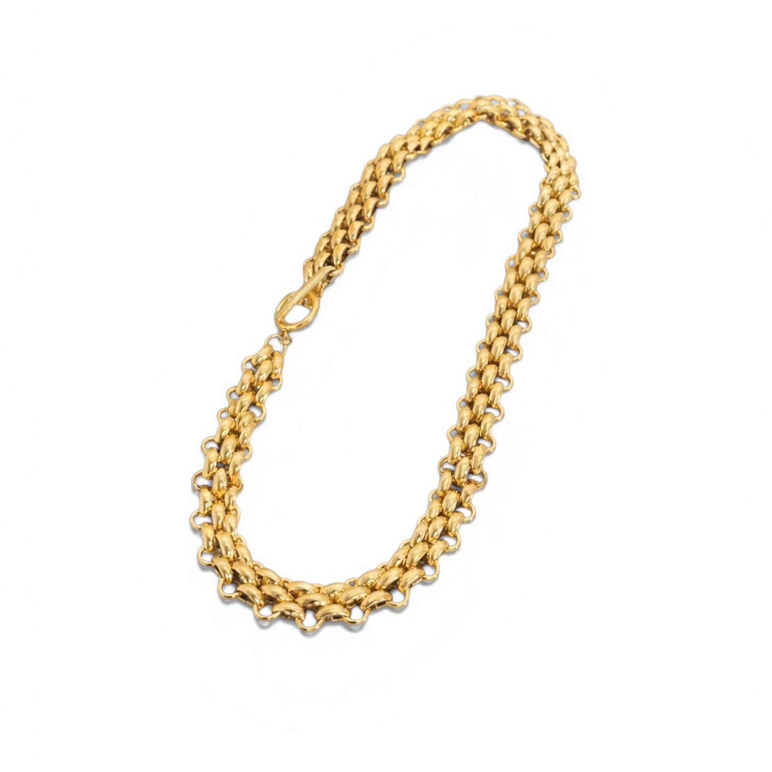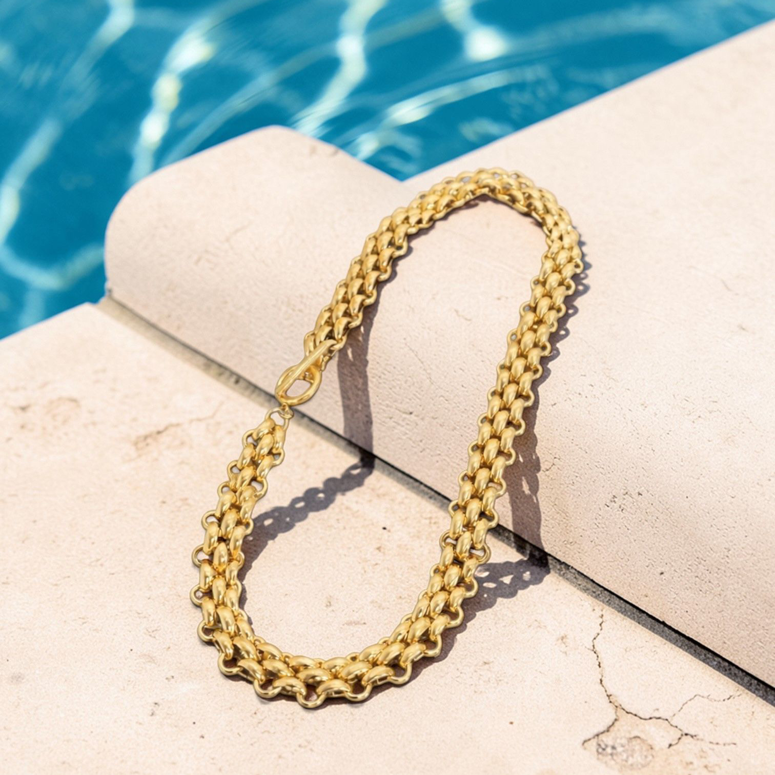 The Ruby Blue London Power Link necklace is designed for women who love bold, confident style with a touch of effortless glamour. This striking necklace features beautifully textured interlocking gold links that create a powerful yet elegant statement.