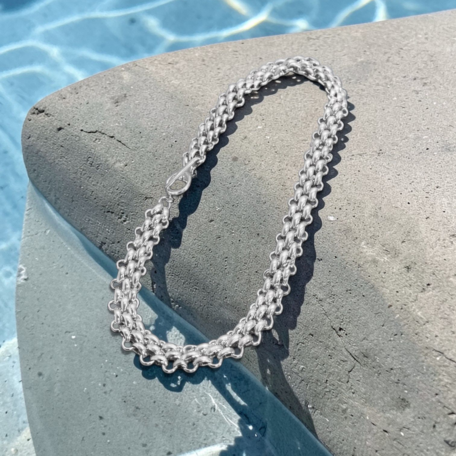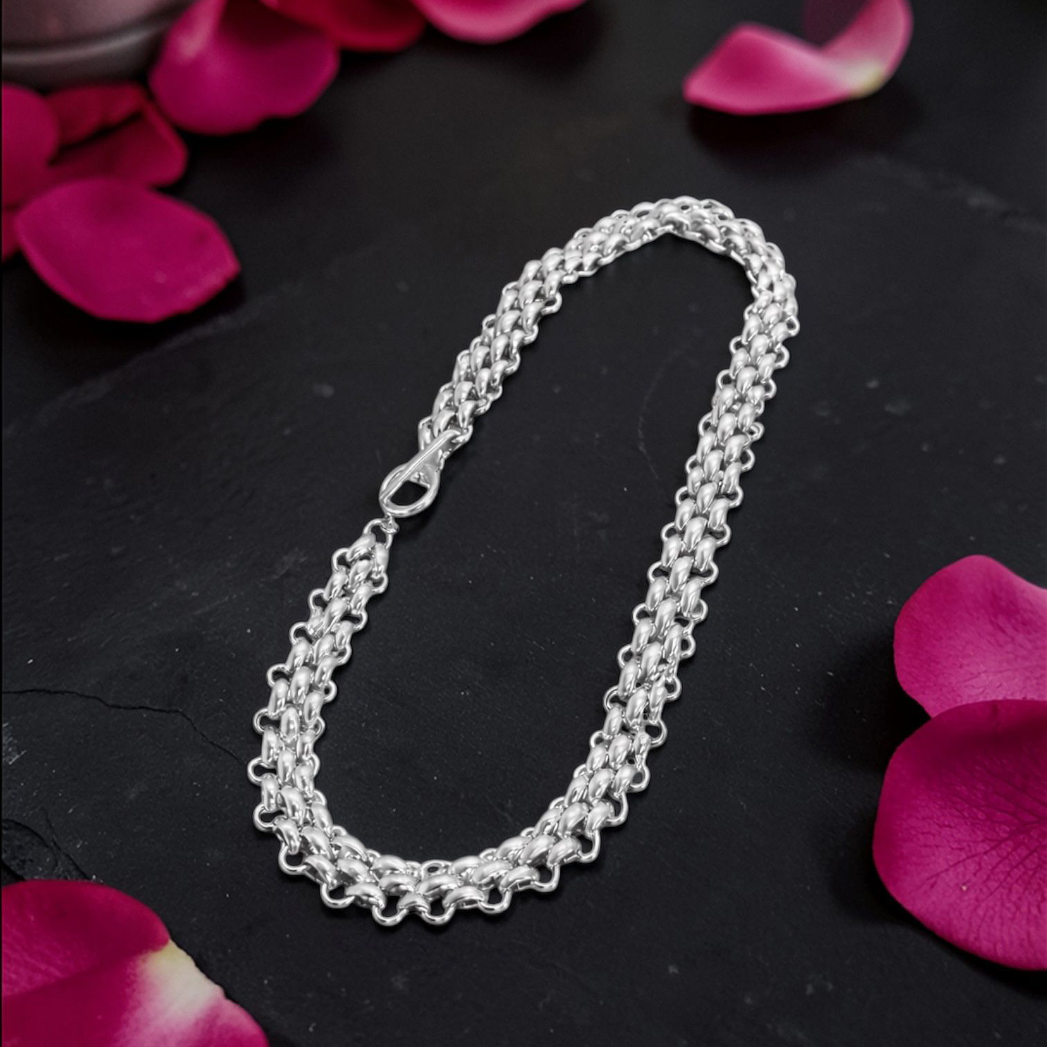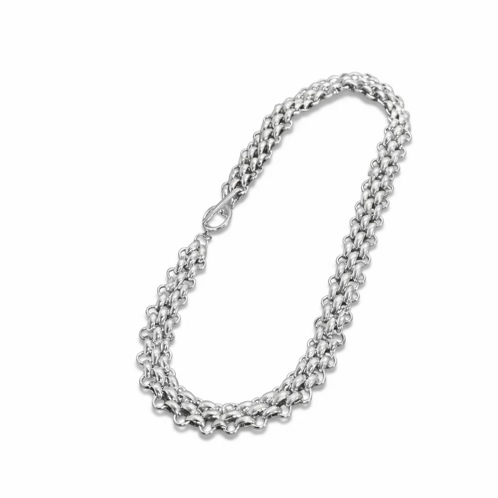 The Ruby Blue London Power Link necklace is designed for women who love bold, confident style with a touch of effortless glamour. This striking necklace features beautifully textured interlocking silver links that create a powerful yet elegant statement.