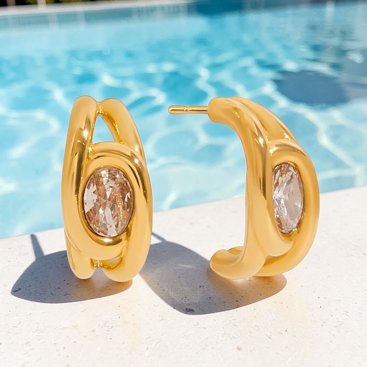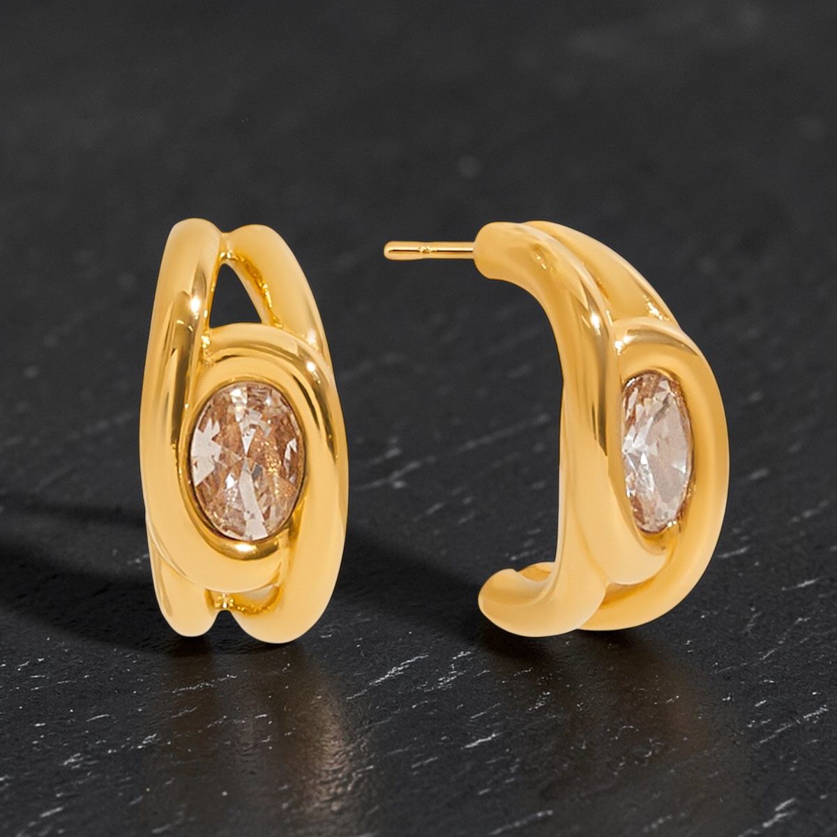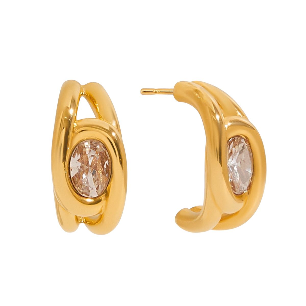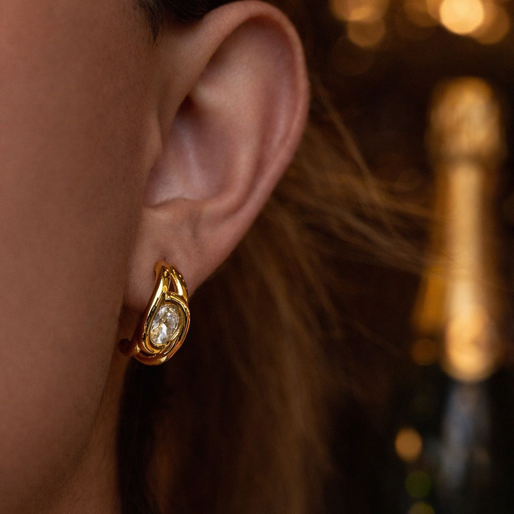 The Sienna Oval Huggies feature a smooth, sculpted gold frame embracing a luminous oval-cut crystal at the centre. Bold yet refined, the curved silhouette hugs the lobe beautifully, catching the light from every angle.