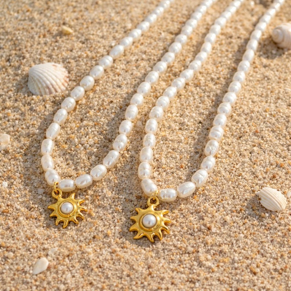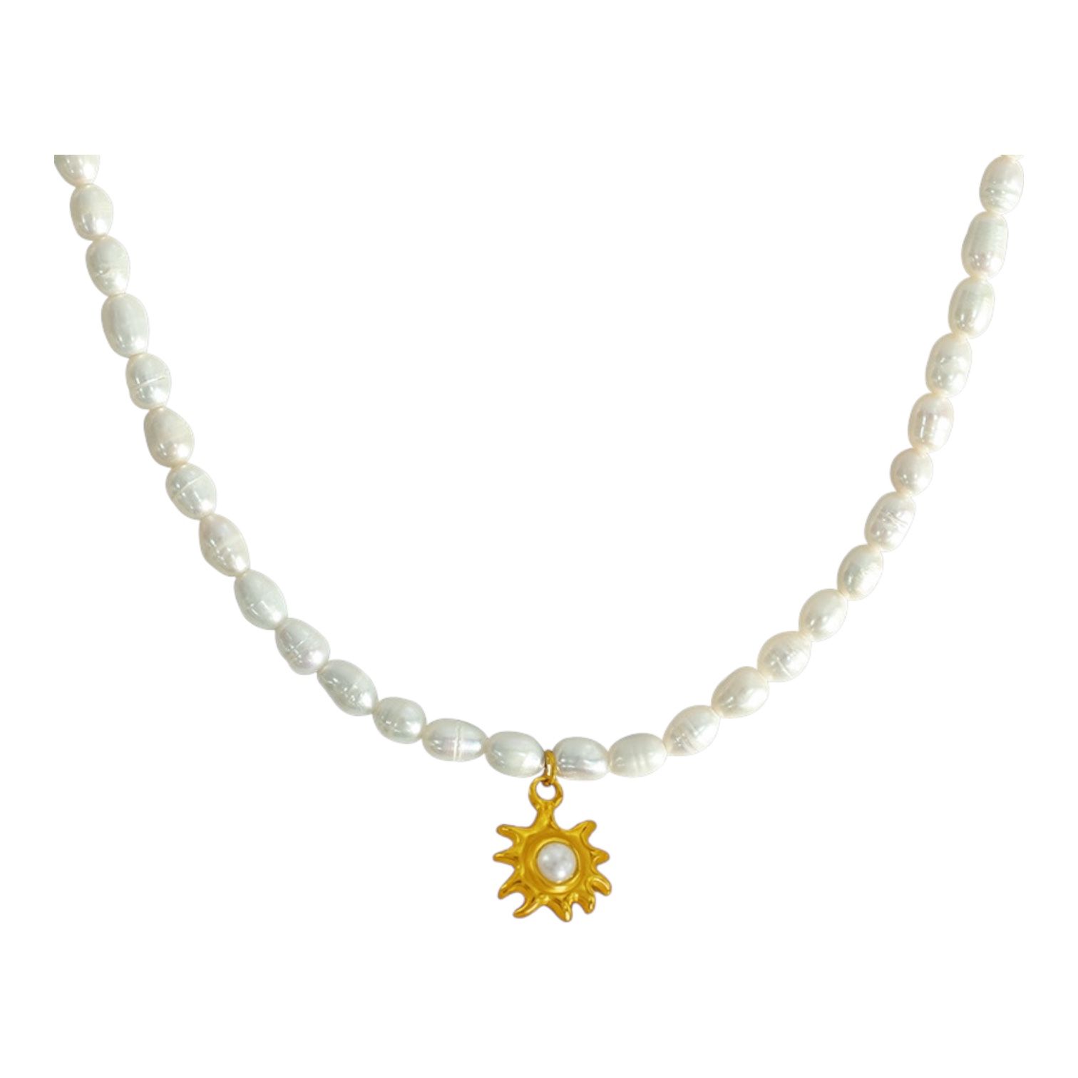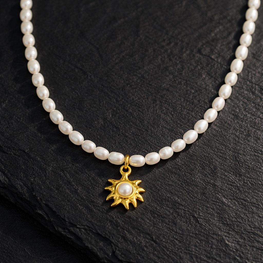 A delicate strand of luminous freshwater pearls finished with a radiant gold sun charm, centred with a soft pearl detail.