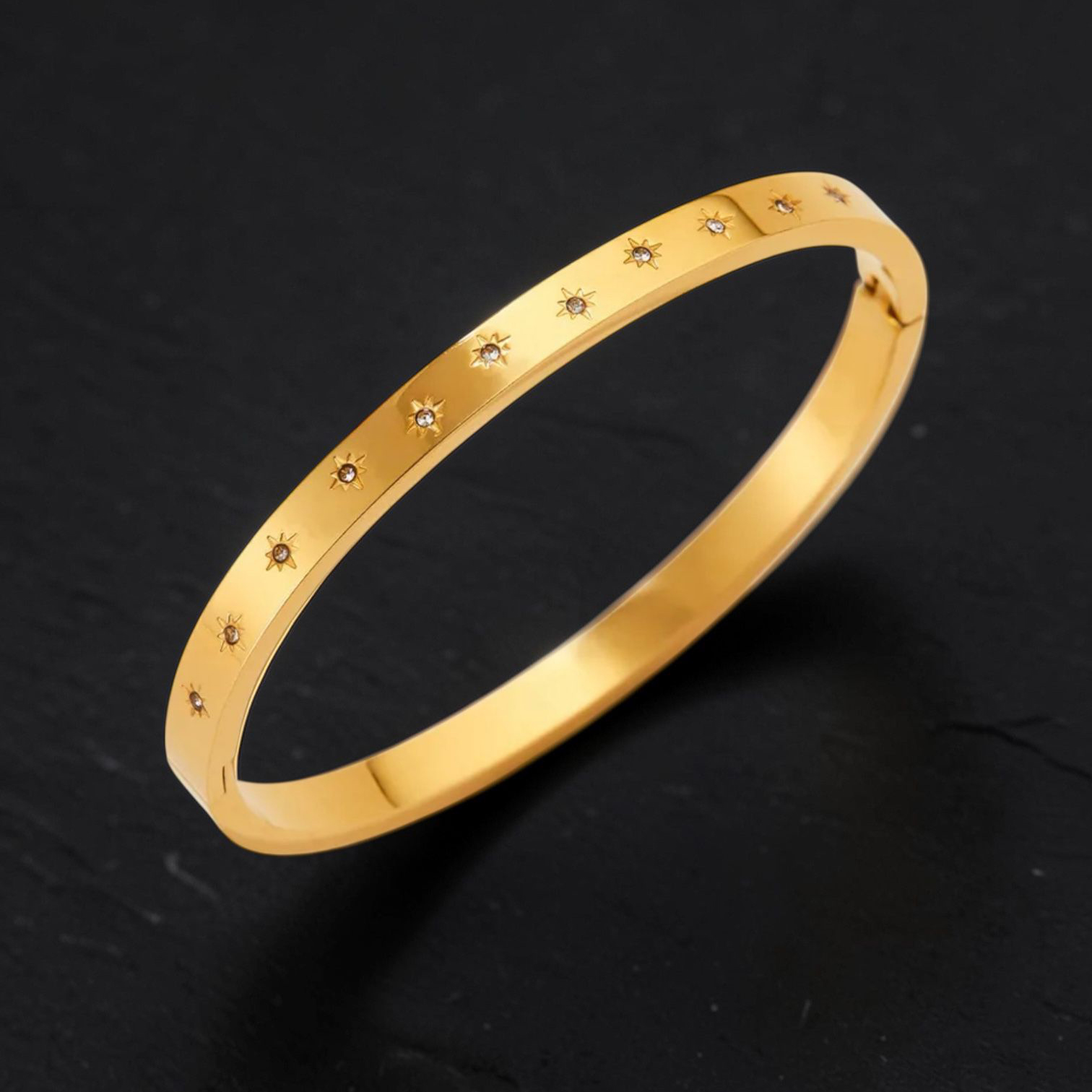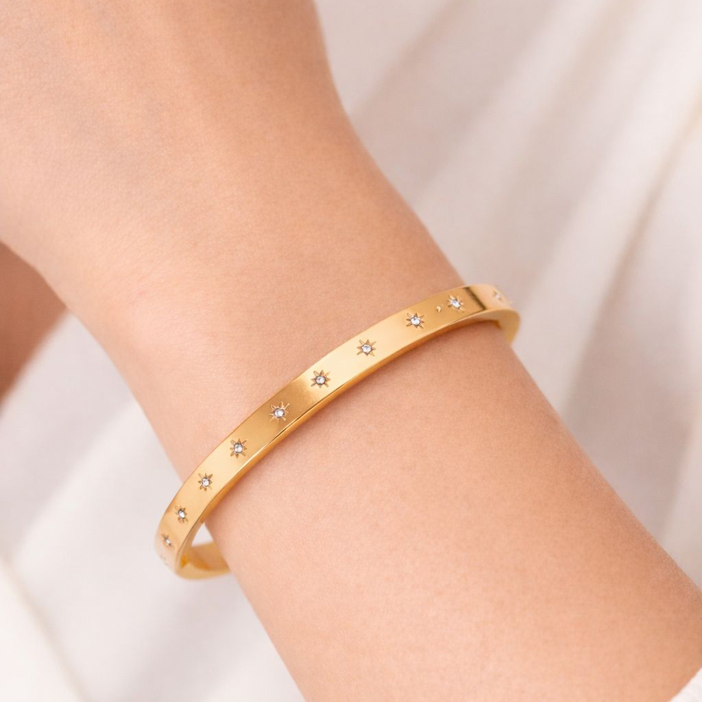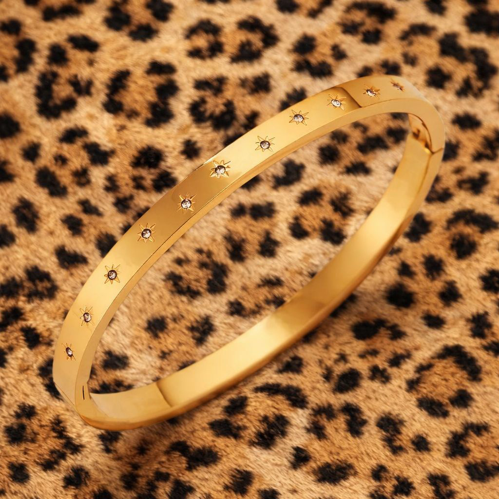 A sleek gold-plated bangle scattered with delicate starlight-set crystals, designed to catch the light with every movement.