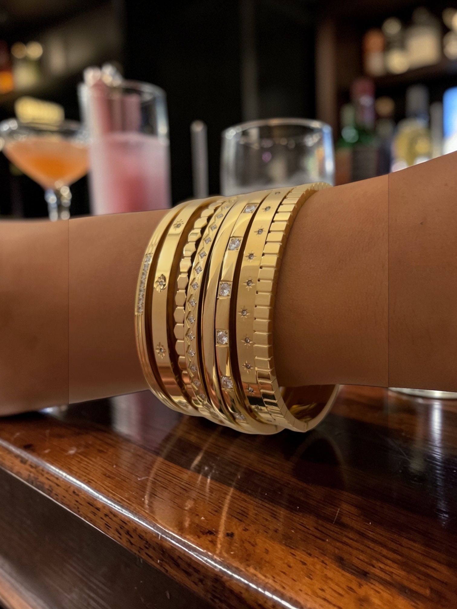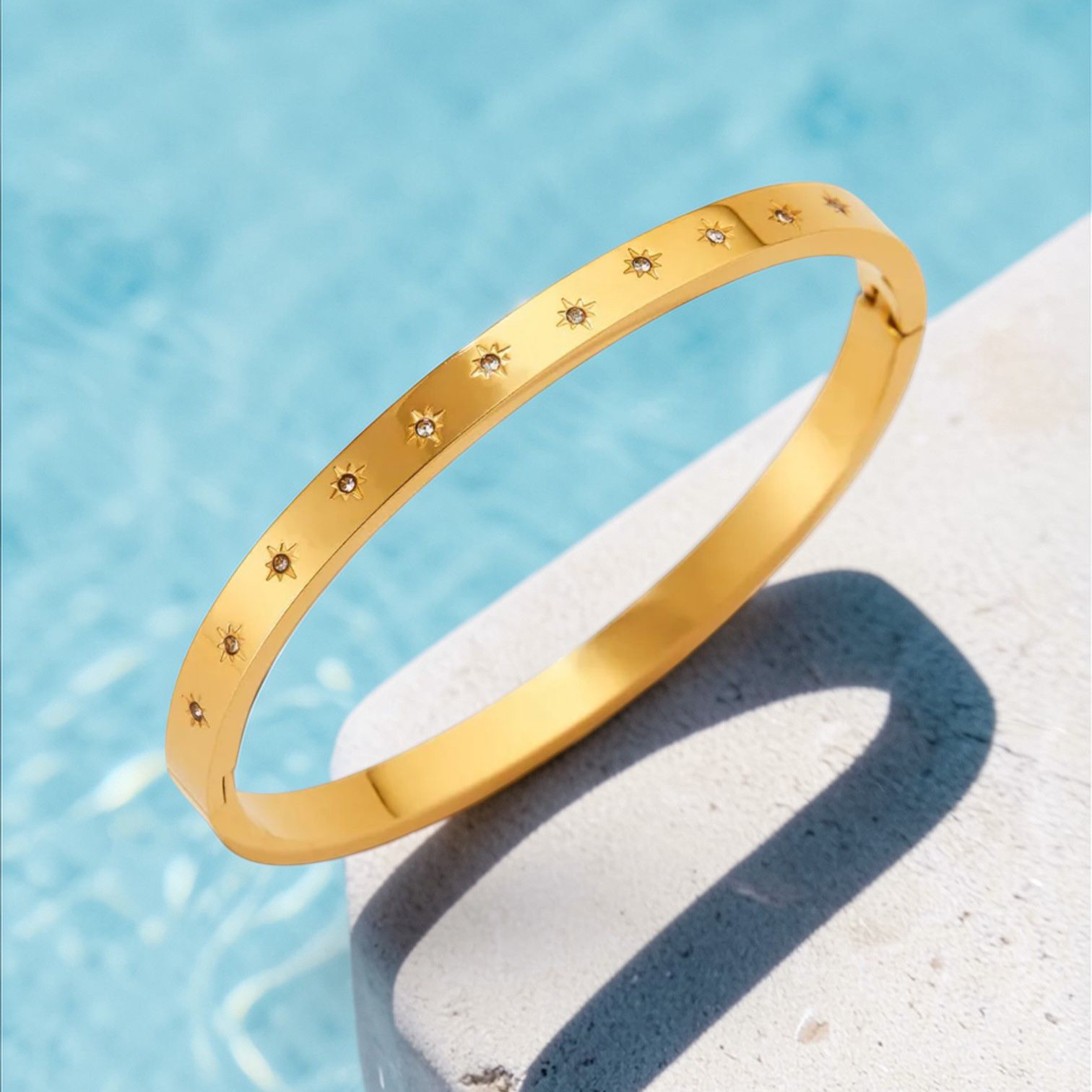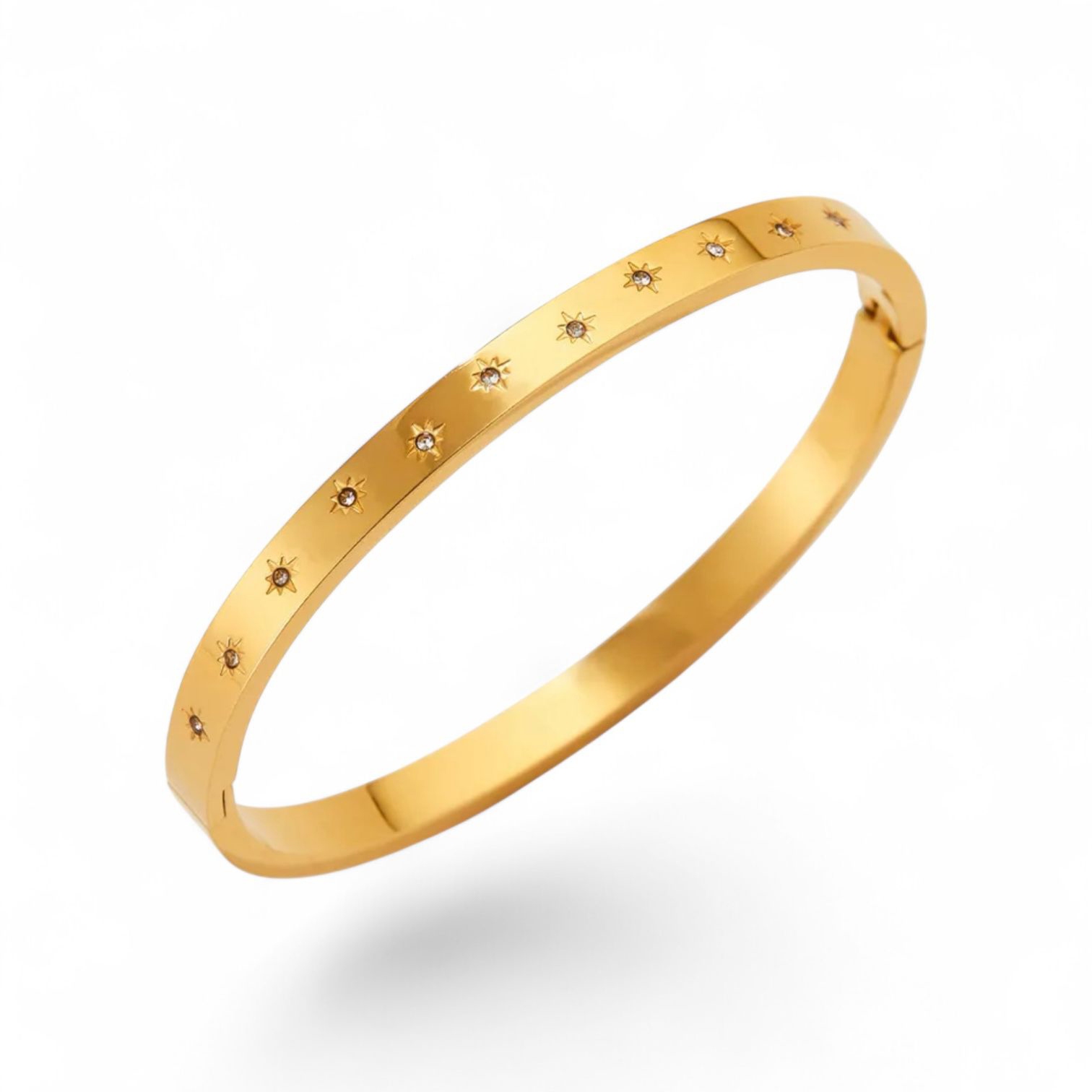 A sleek gold-plated bangle scattered with delicate starlight-set crystals, designed to catch the light with every movement.