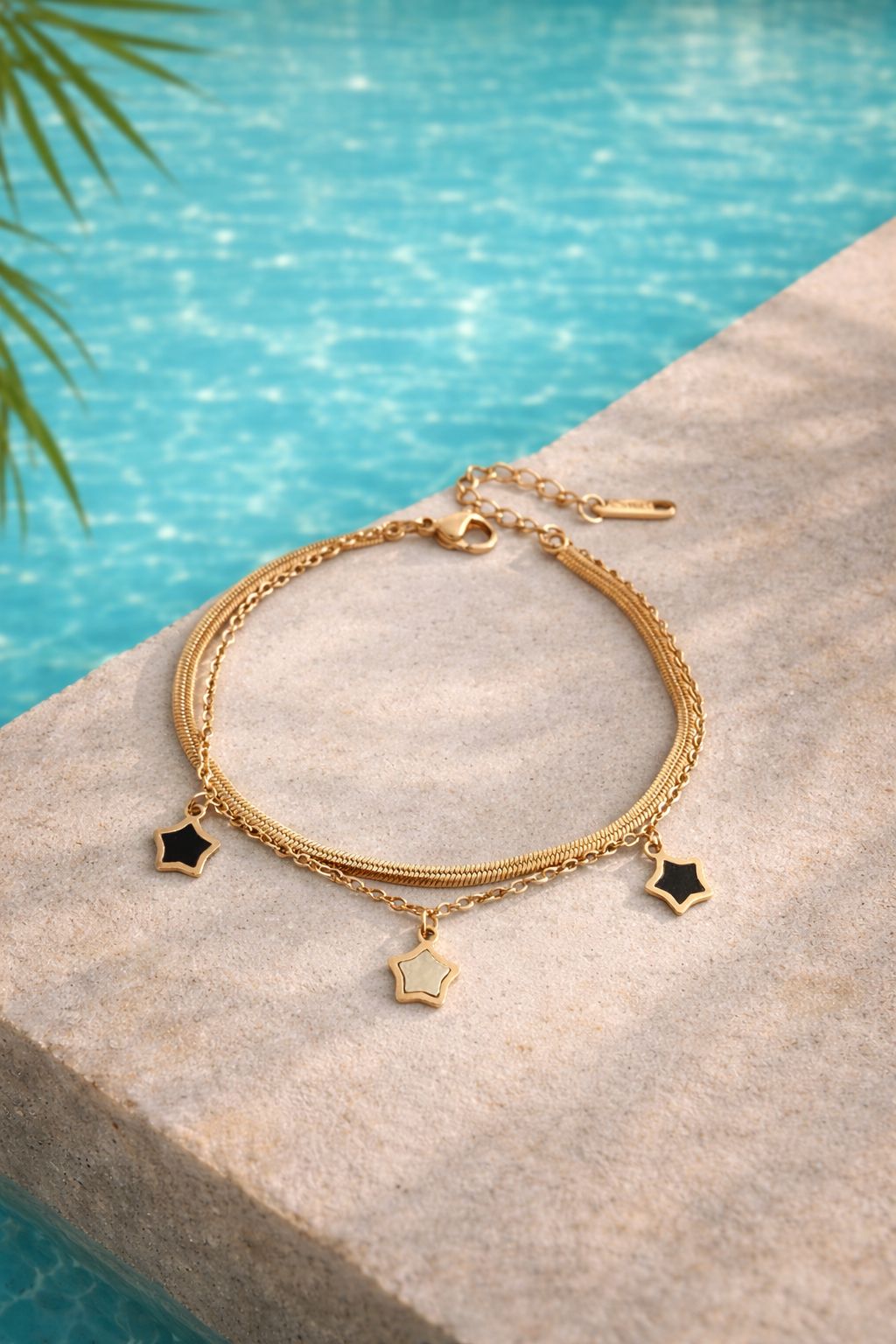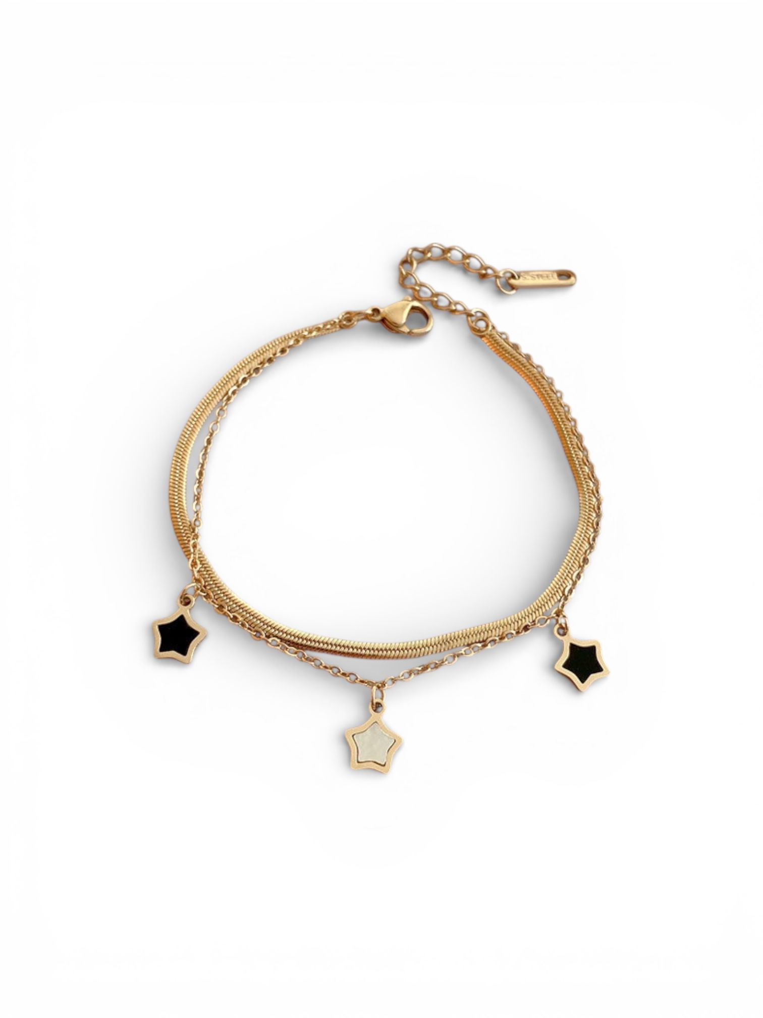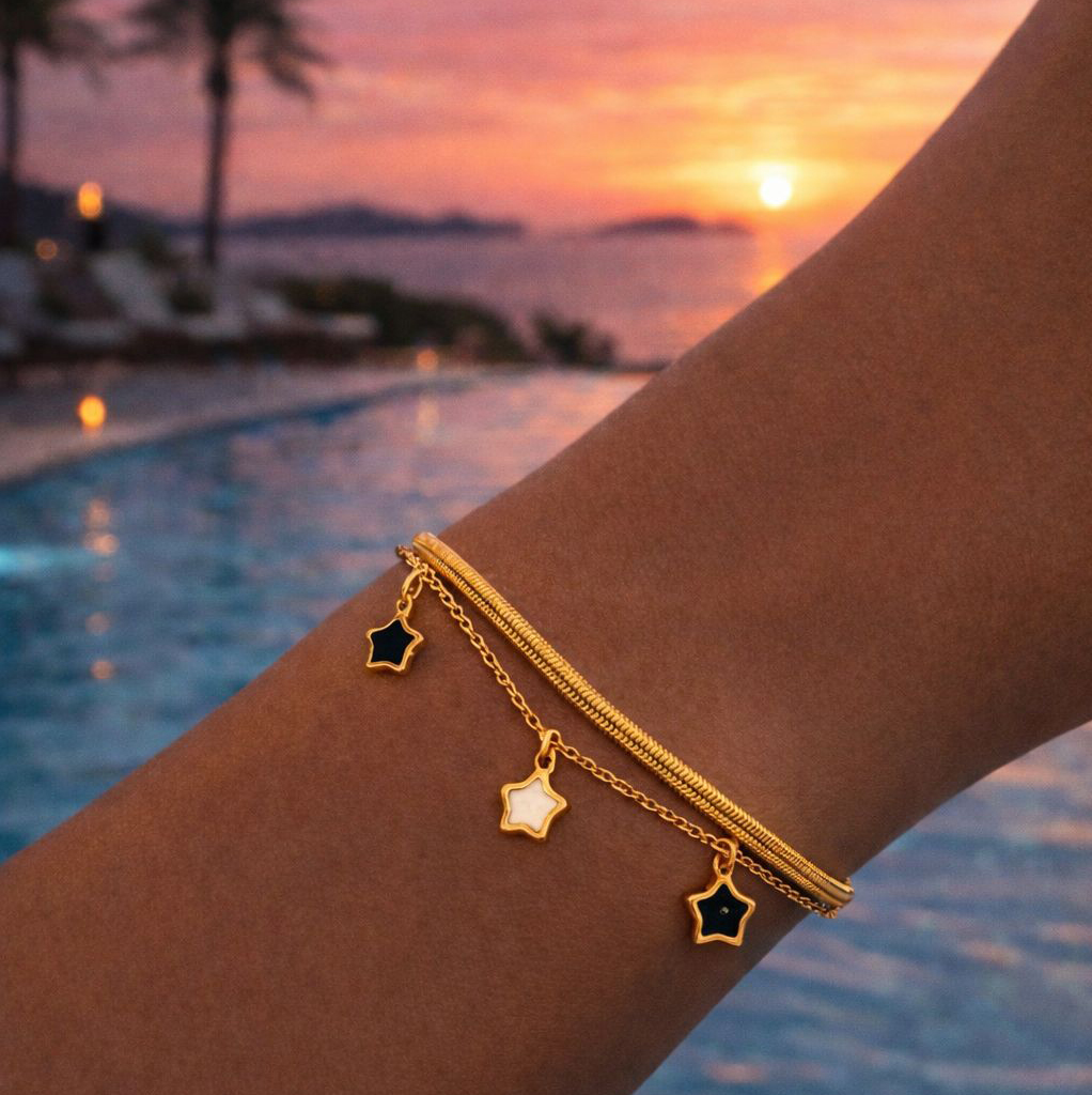 A delicate layered gold bracelet, featuring sleek mixed chains and subtle star charms. Elegant, modern and effortlessly wearable — the perfect everyday piece with a soft celestial glow.