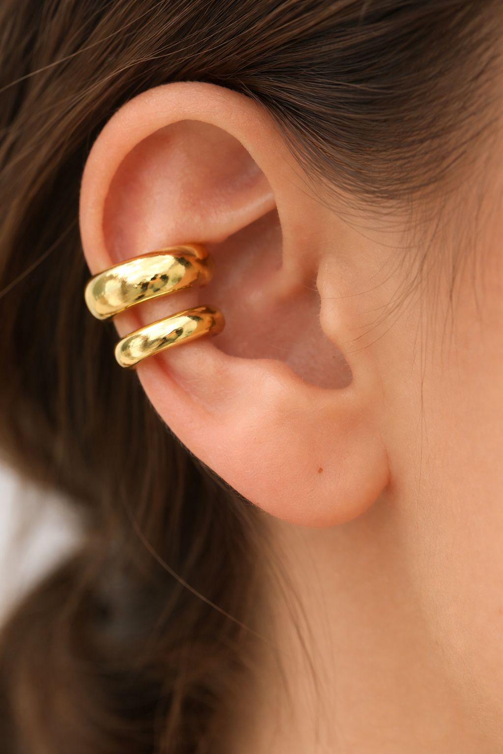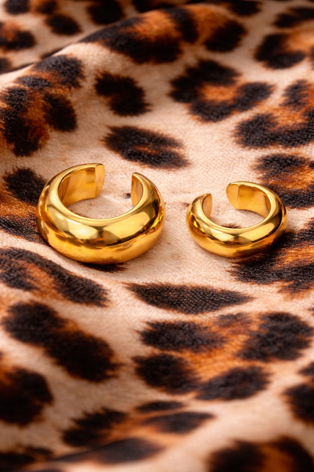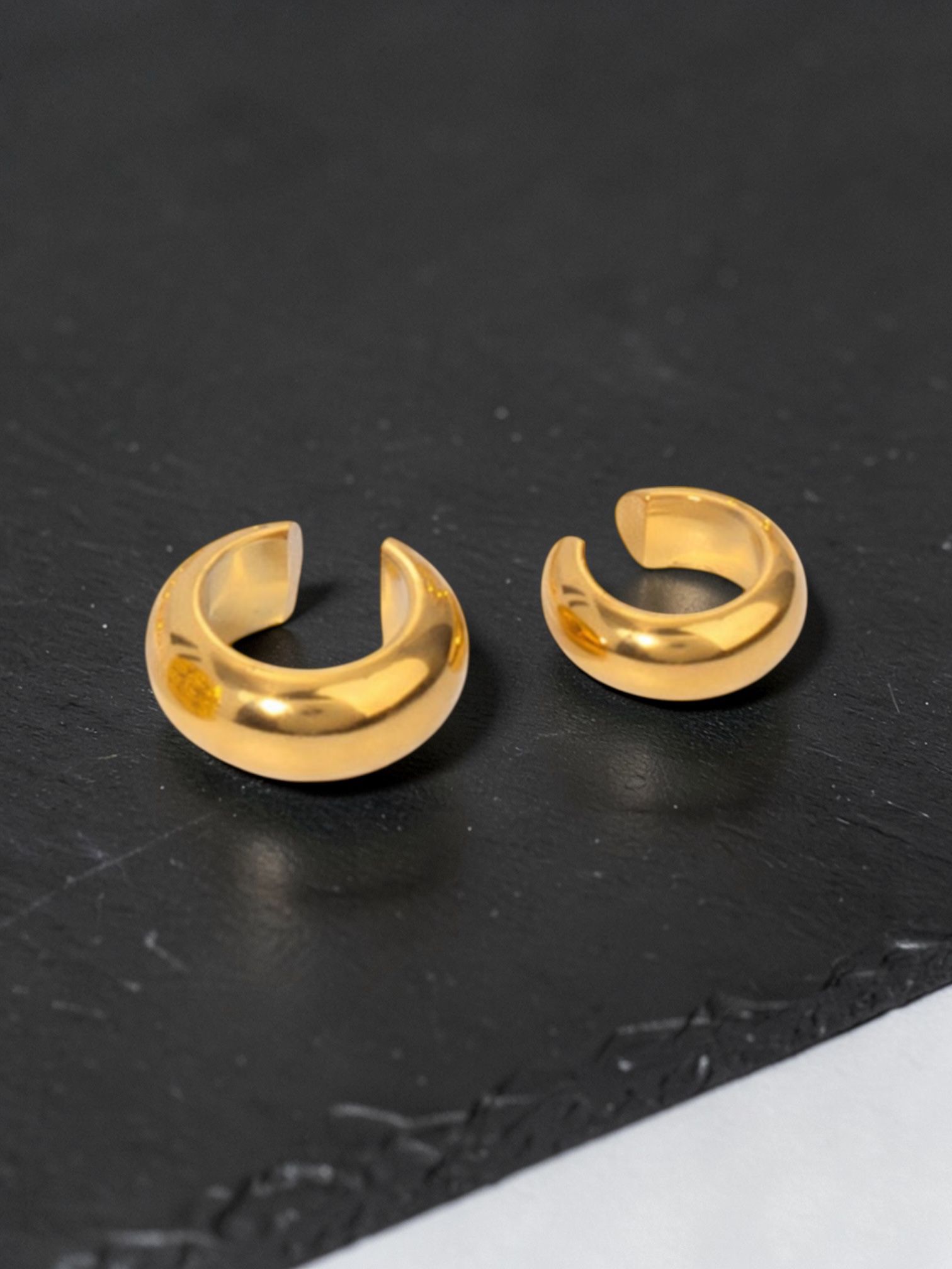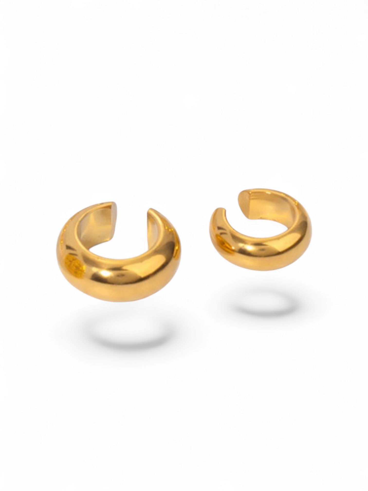 A modern statement pairing of smooth, high-shine gold cuffs designed to elevate any ear stack. Featuring one bold, sculpted chunky cuff and one slimmer curved cuff, this duo creates effortless dimension and balance without the need for piercings.