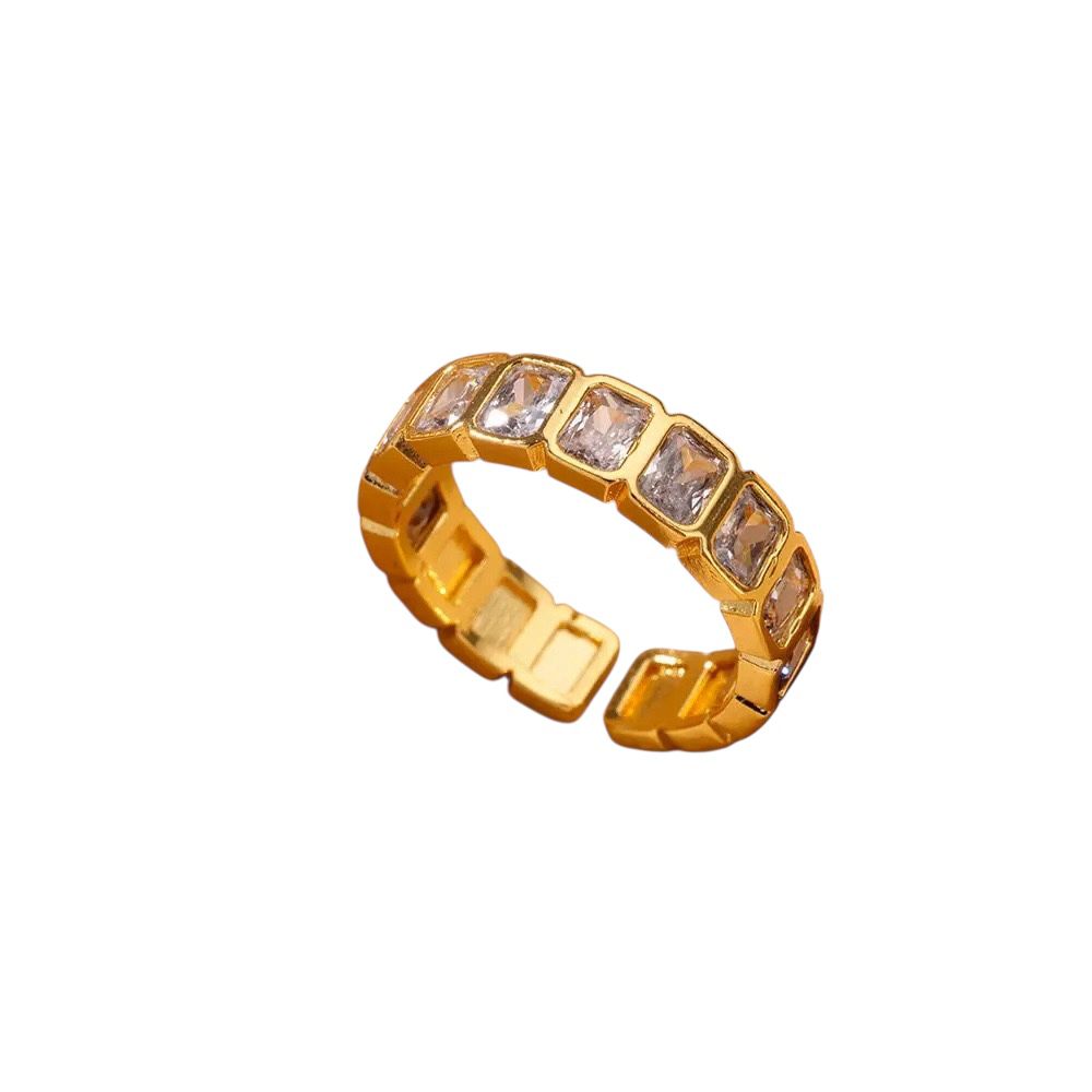 A radiant gold open band set with vibrant clear emerald-cut crystals in a rich spectrum of jewel tones.